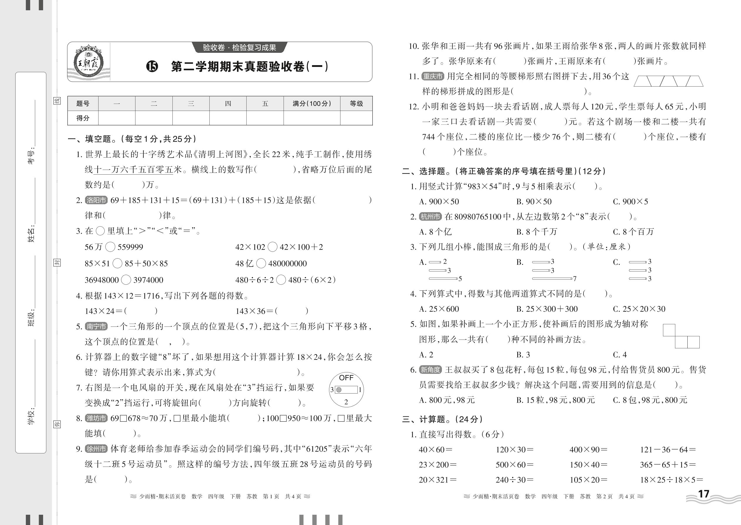 2024下册四年级数学苏教版 第二学期期末真题验收卷(一)
