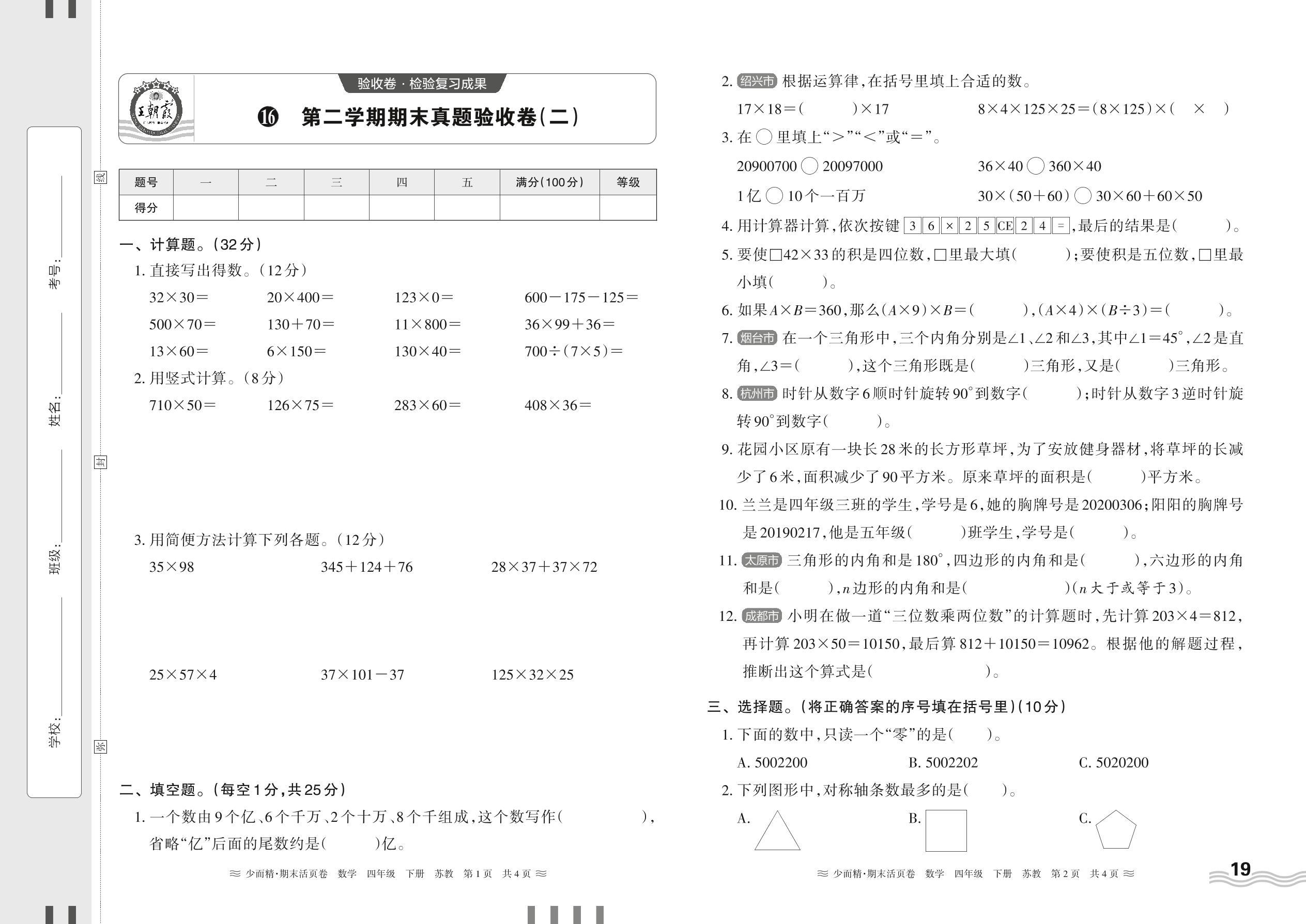 2024下册四年级数学苏教版 第二学期期末真题验收卷(二)