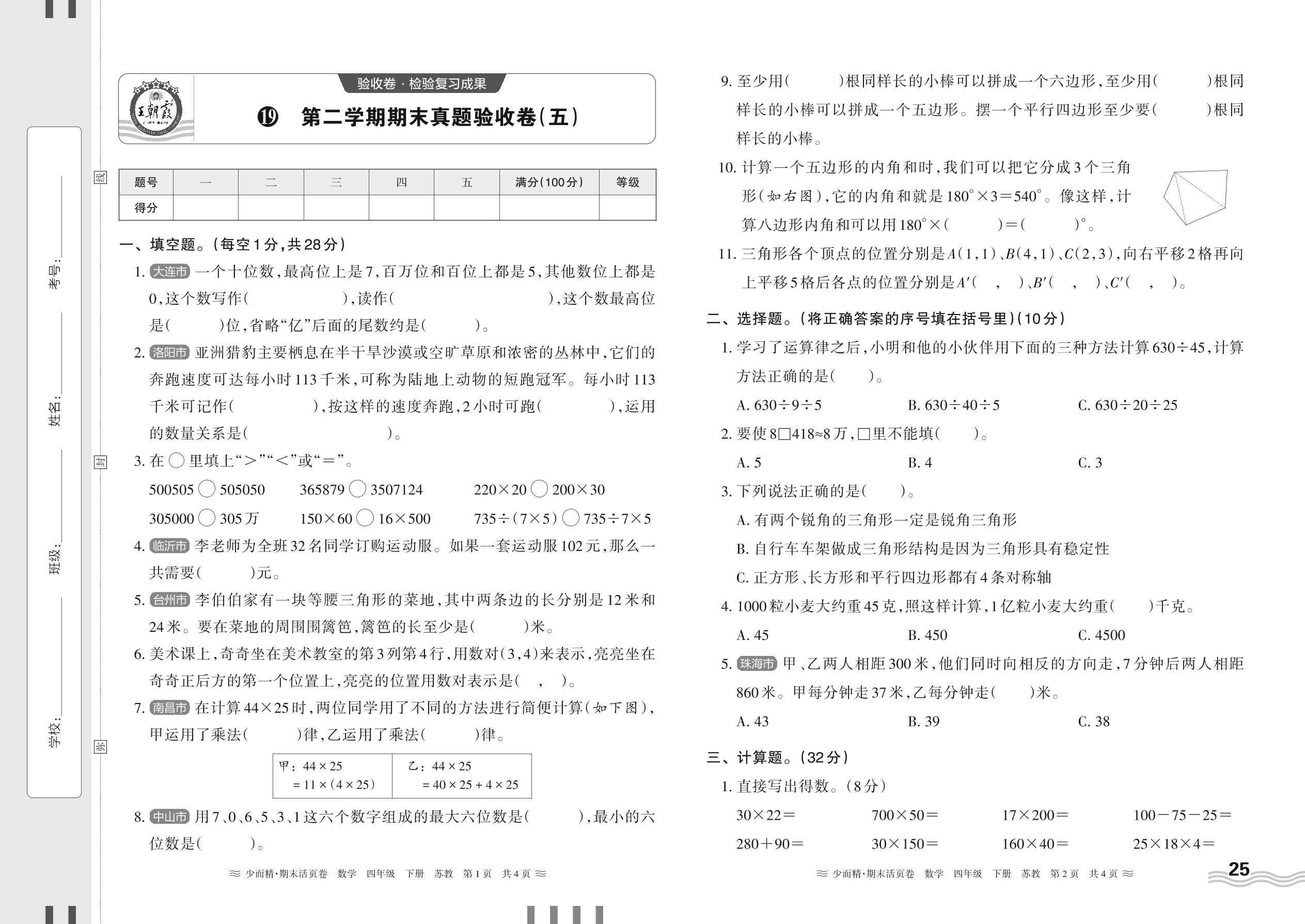 四年级数学苏教版下册期末卷