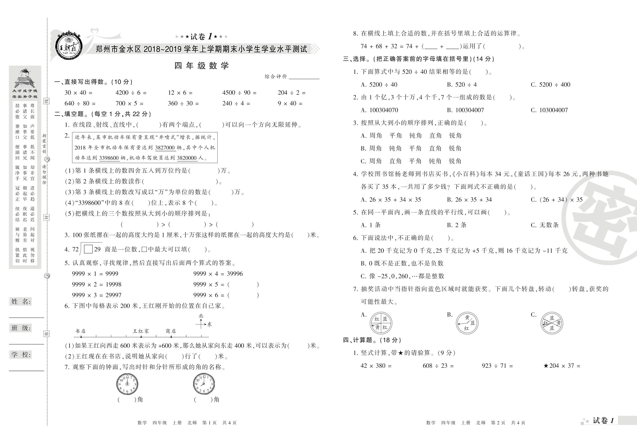 2018-2019学年第一学期郑州市金水区四年级数学试卷(北师版)_R210804145122【1】