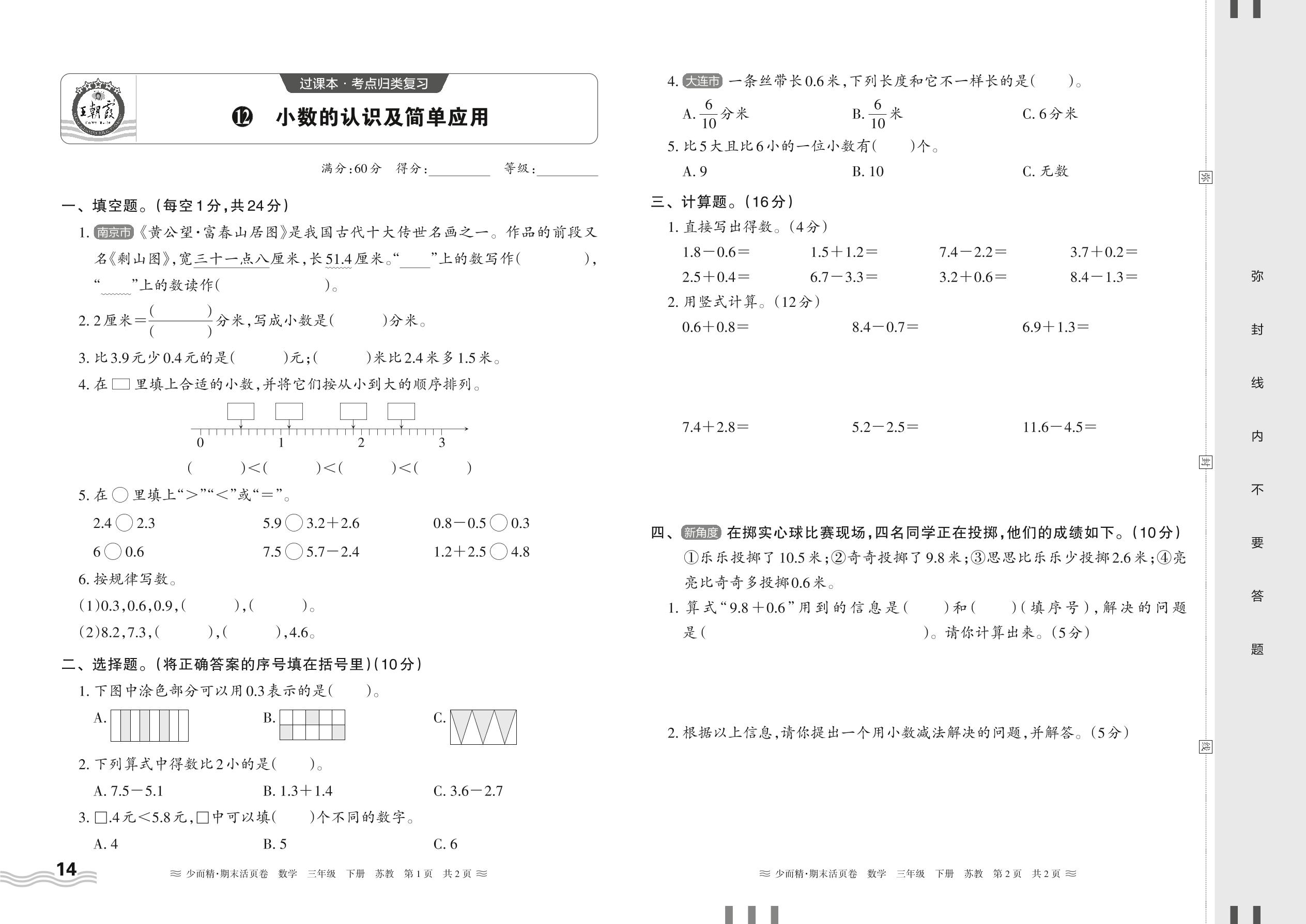 2024下册三年级数学苏教版 期末过课本HY版·小数的认识及简单应用正文【12】