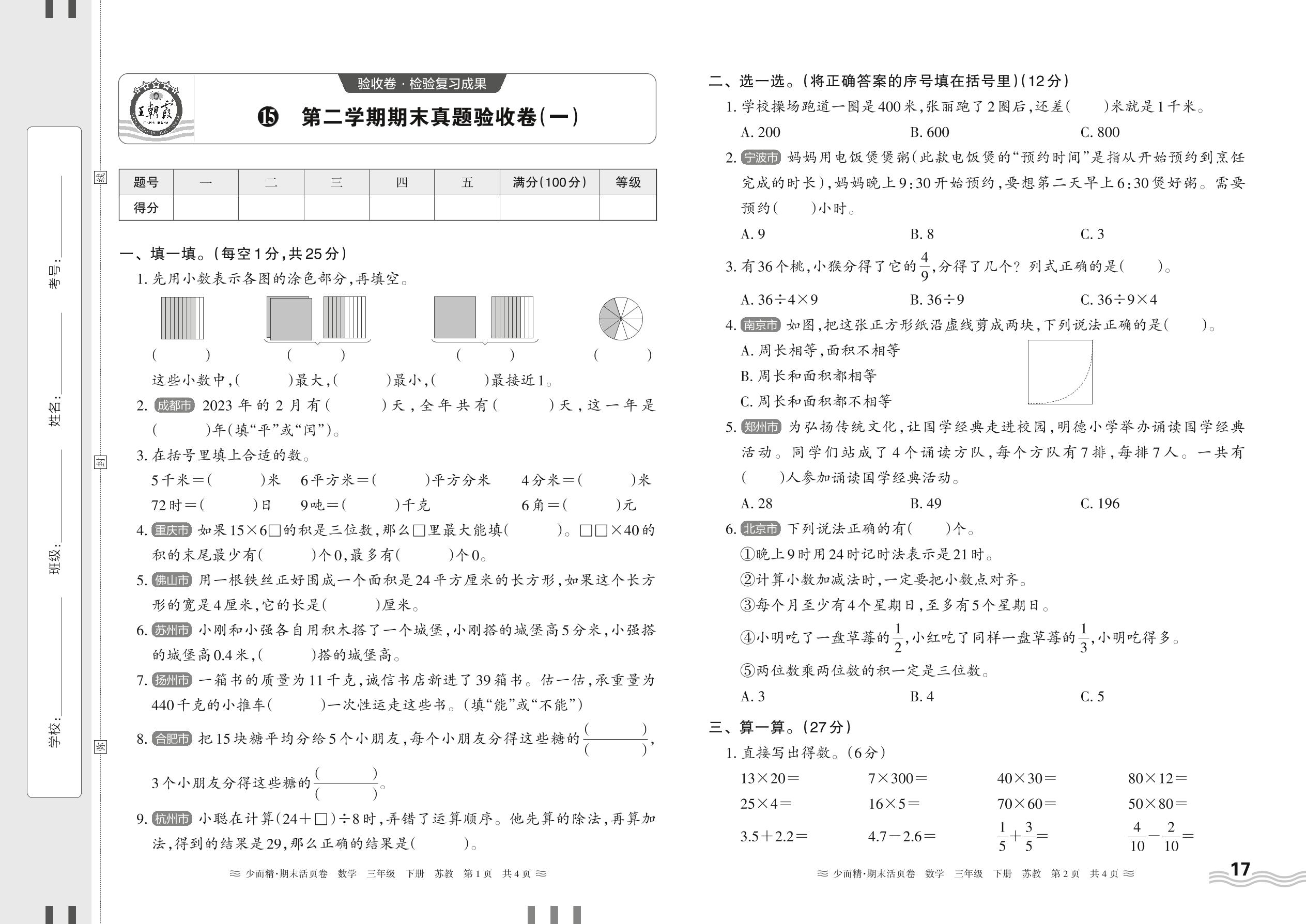 2024下册三年级数学苏教版 第二学期期末真题验收卷(一)
