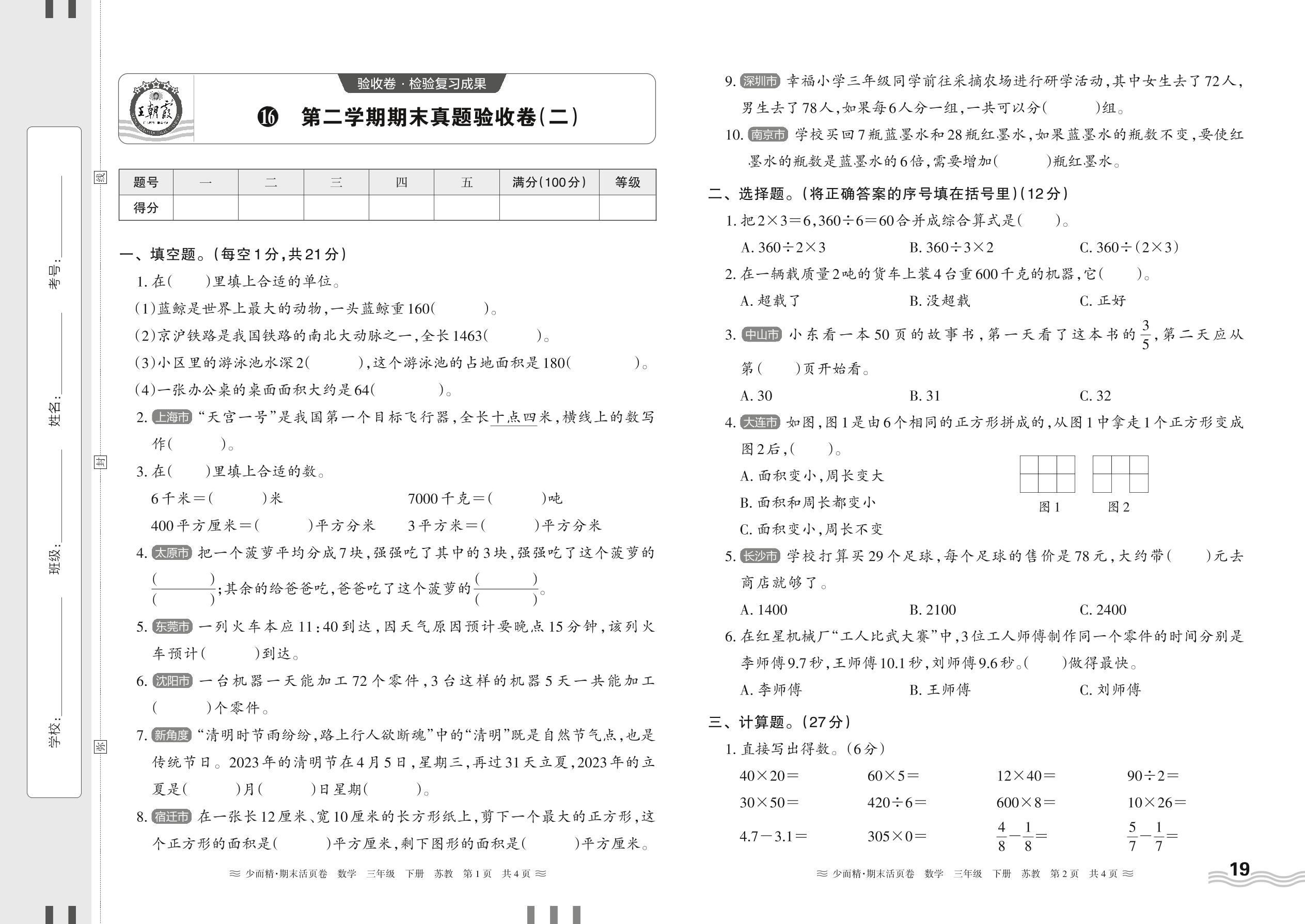 2024下册三年级数学苏教版 第二学期期末真题验收卷(二)