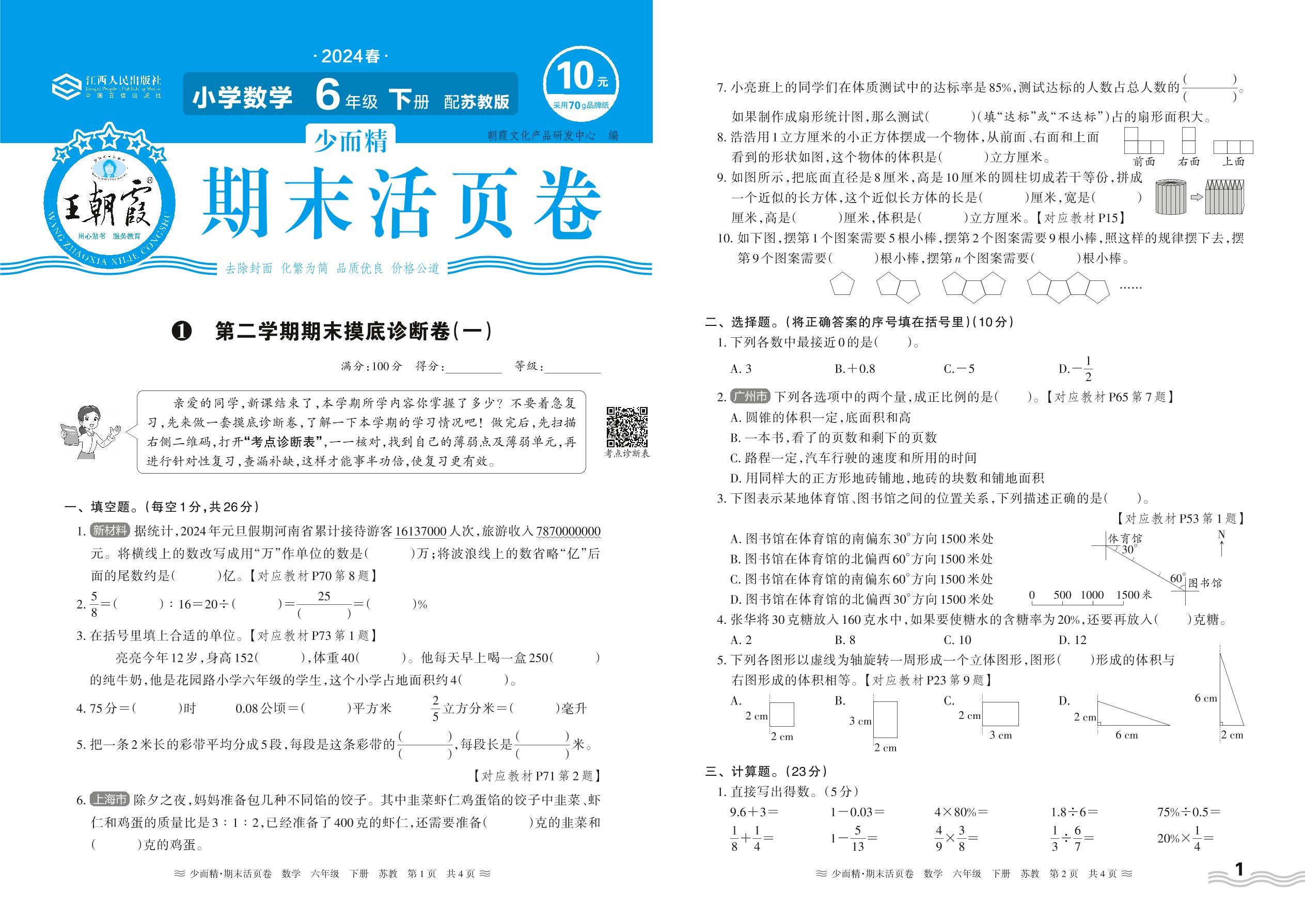 2024下册六年级数学苏教版 第二学期期末摸底诊断卷(一)