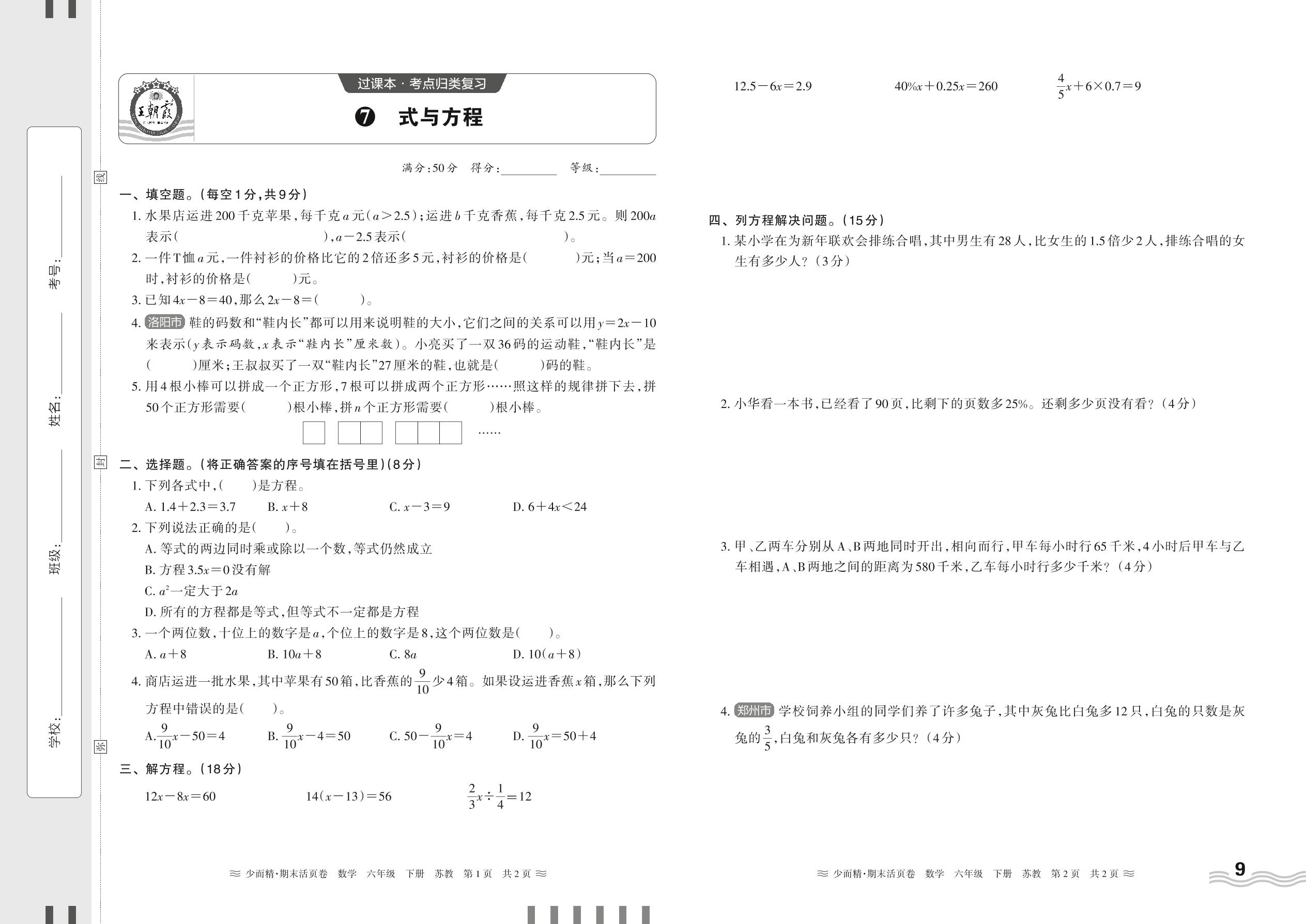 2024下册六年级数学苏教版 期末过课本HY版·式与方程正文【7】