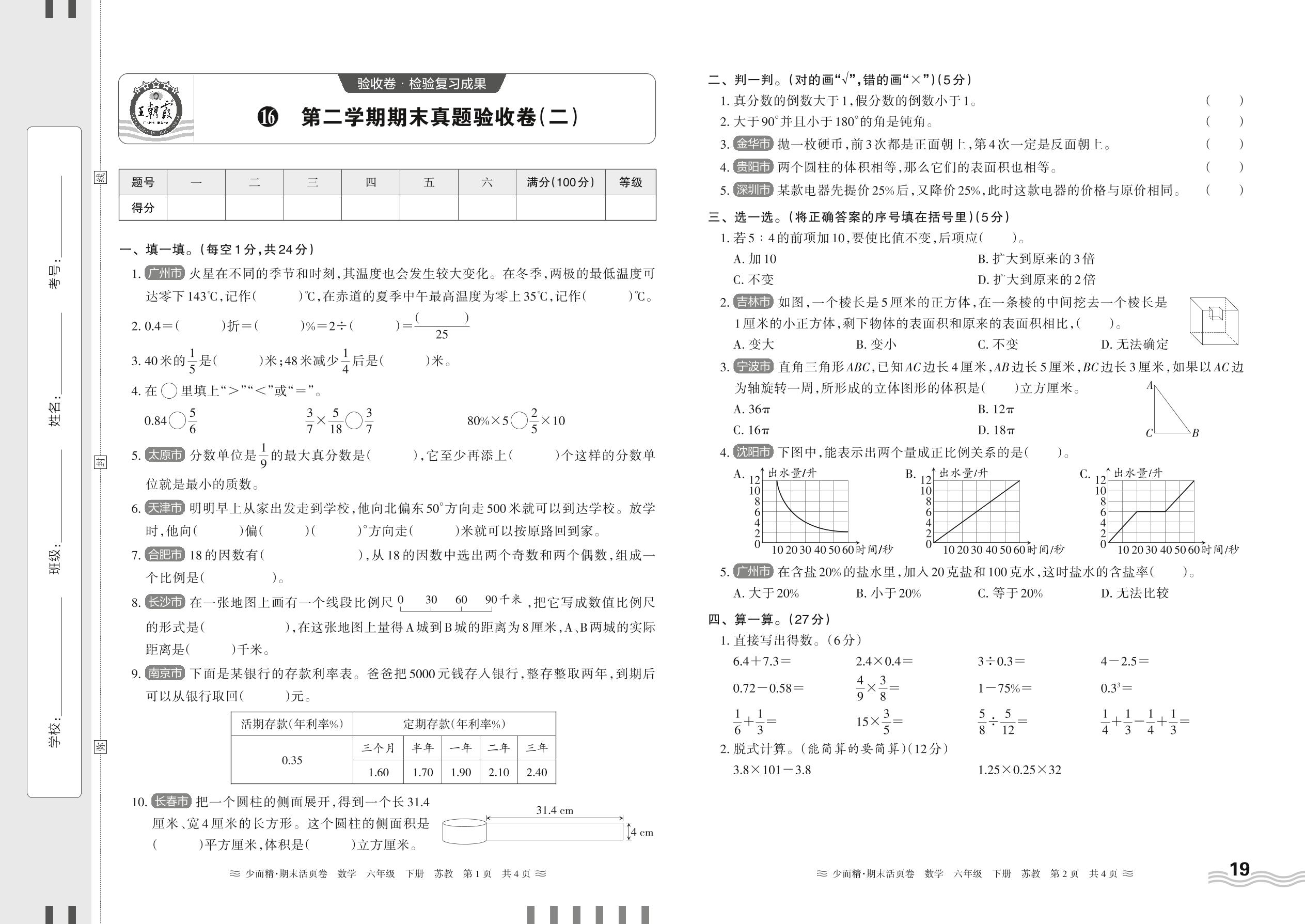 2024下册六年级数学苏教版 第二学期期末真题验收卷(二)