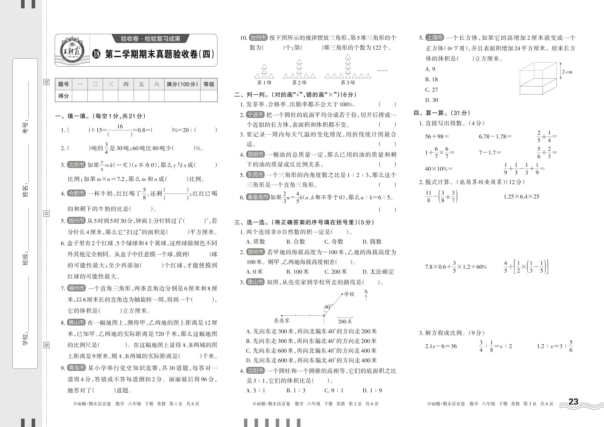 六年级数学苏教版下册期末卷