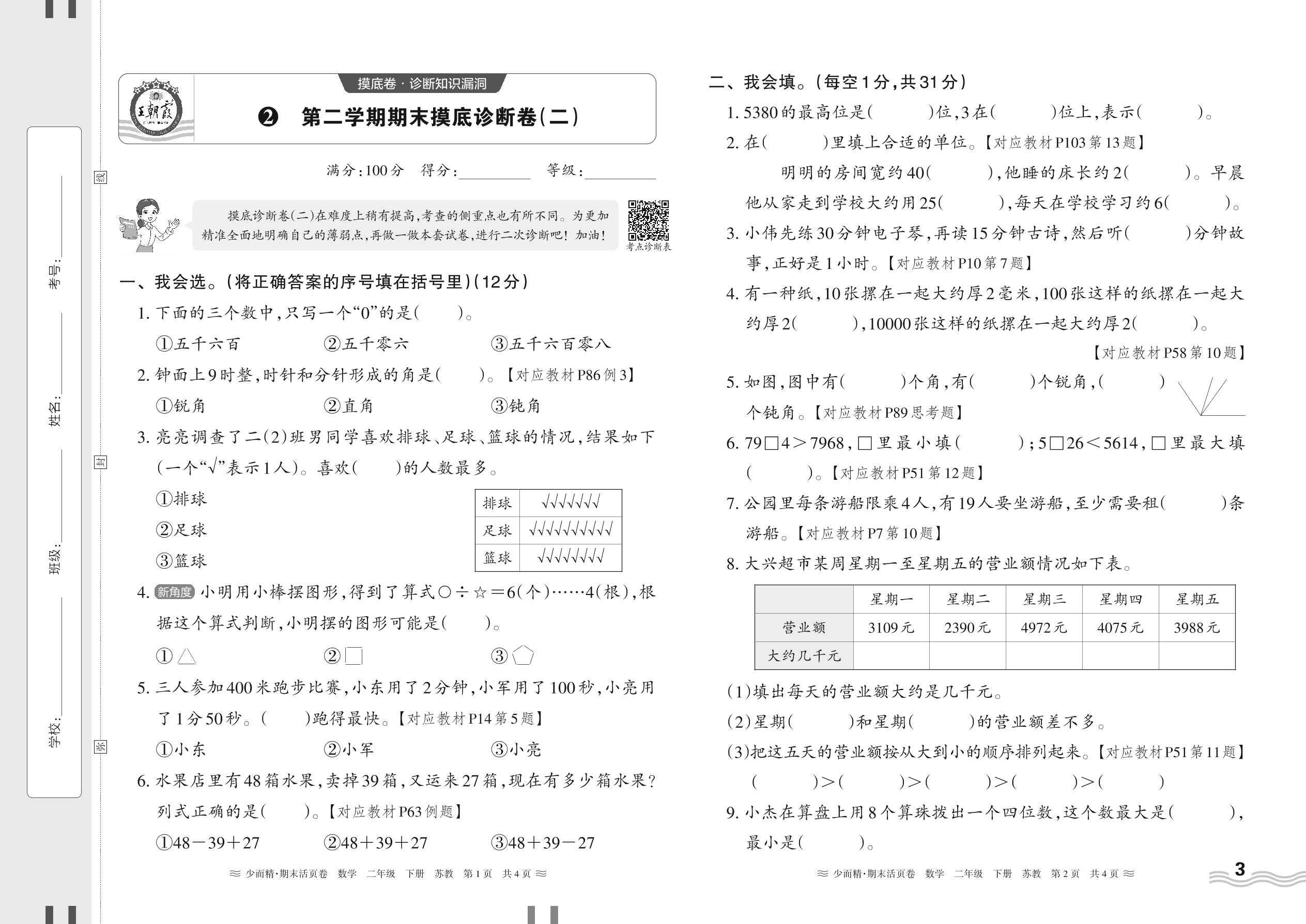 2024下册二年级数学苏教版 第二学期期末摸底诊断卷(二)