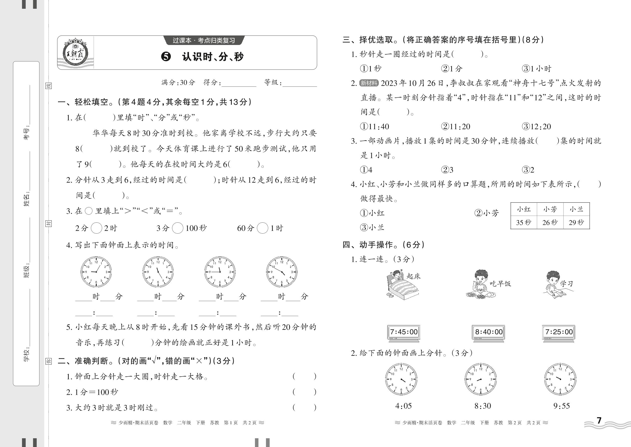2024下册二年级数学苏教版 期末过课本HY版·认识时、分、秒正文【5】