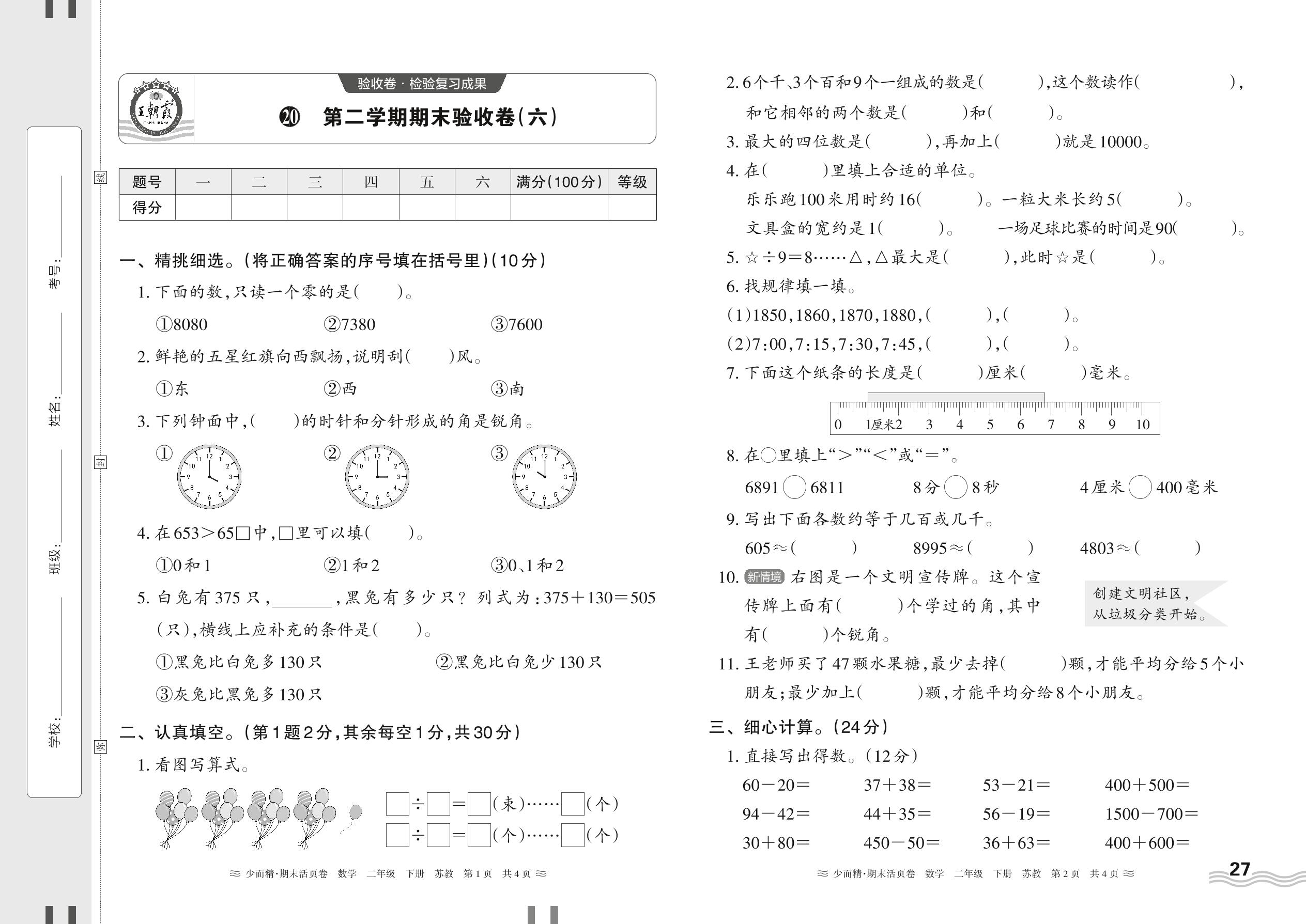 2024下册二年级数学苏教版 第二学期期末真题验收卷(六)