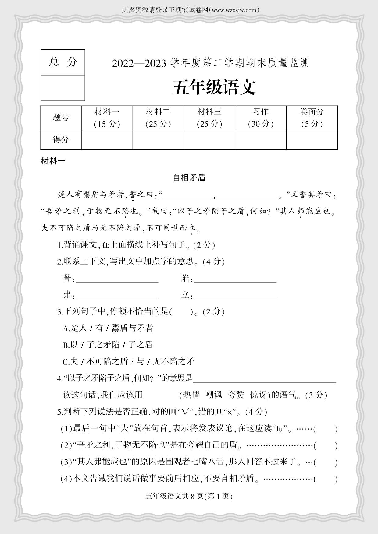 河北省保定市定州市2022-2023学年度第二学期期末质量检测五年级语文(人教版)