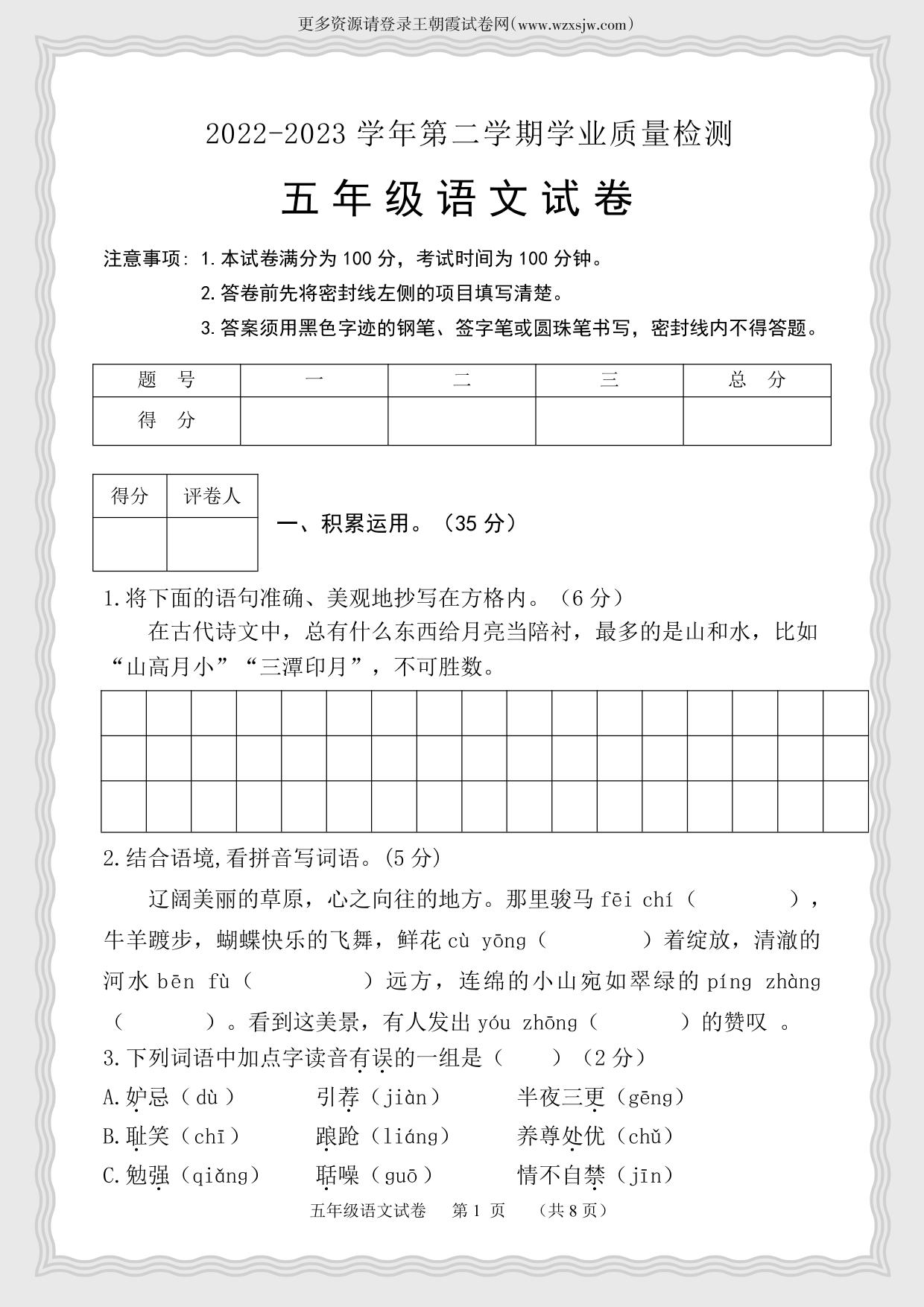 河北省保定市唐县2022-2023学年第二学期期末学业质量检测试卷五年级语文(人教版)