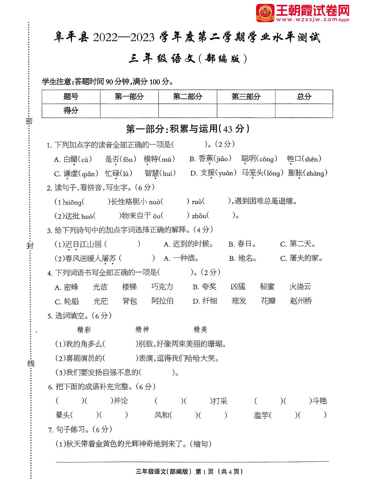 河北省保定市阜平县2022-2023学年度第二学期期末学业水平测试三年级语文(人教版)