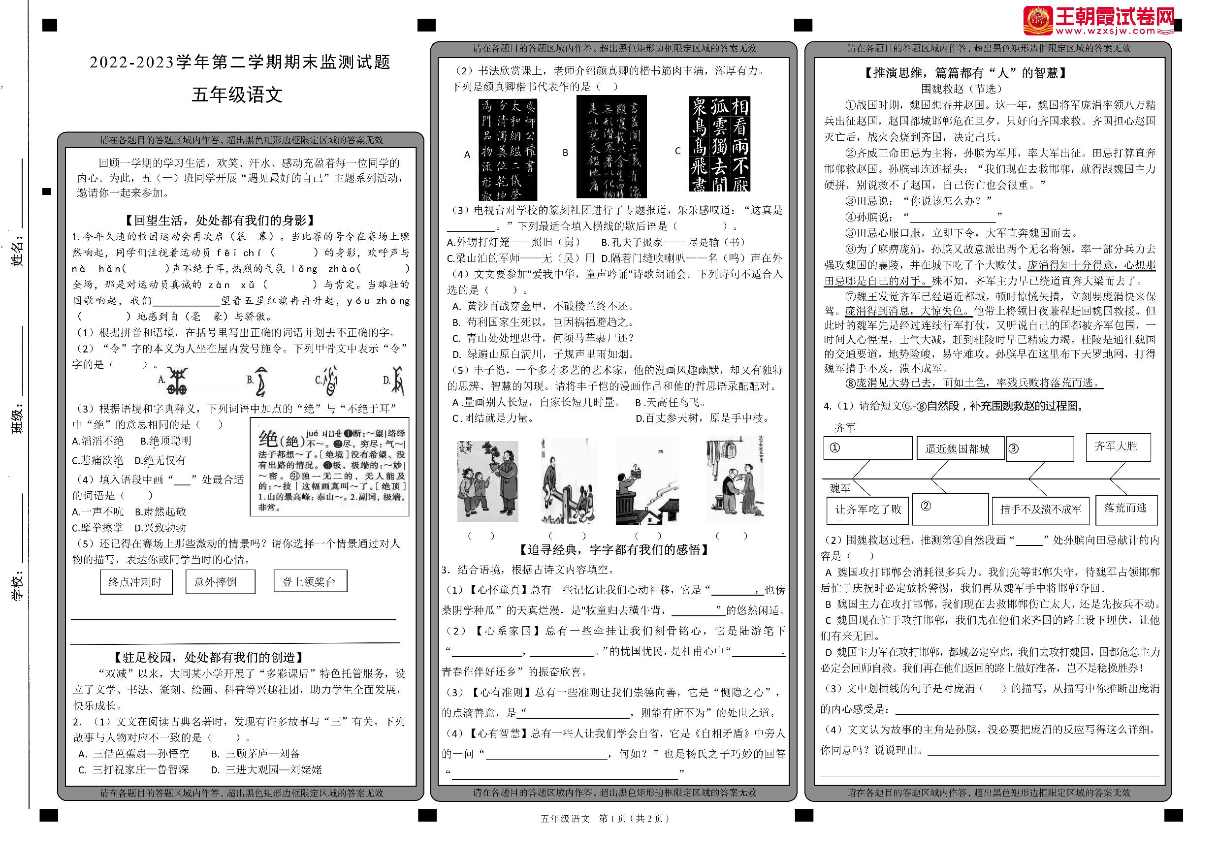 山西省大同市新荣区2022-2023学年第二学期期末监测试题五年级语文(人教版)