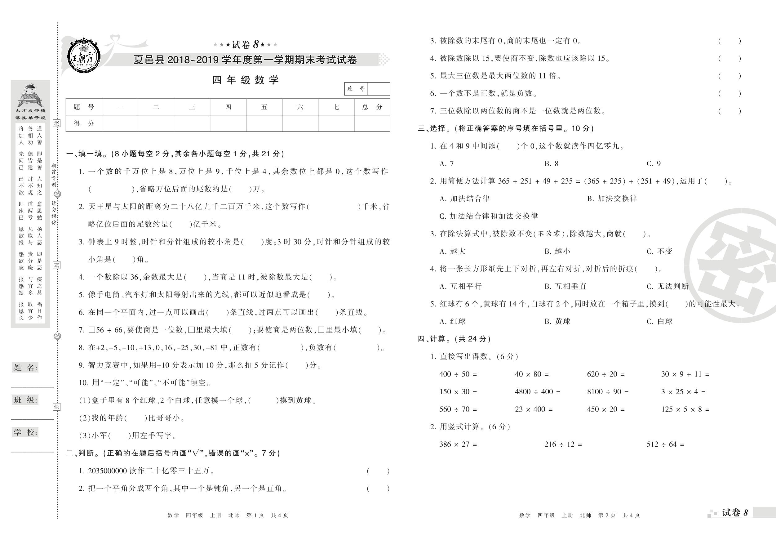 2018-2019学年第一学期商丘市夏邑县四年级数学试卷(北师版)【8】