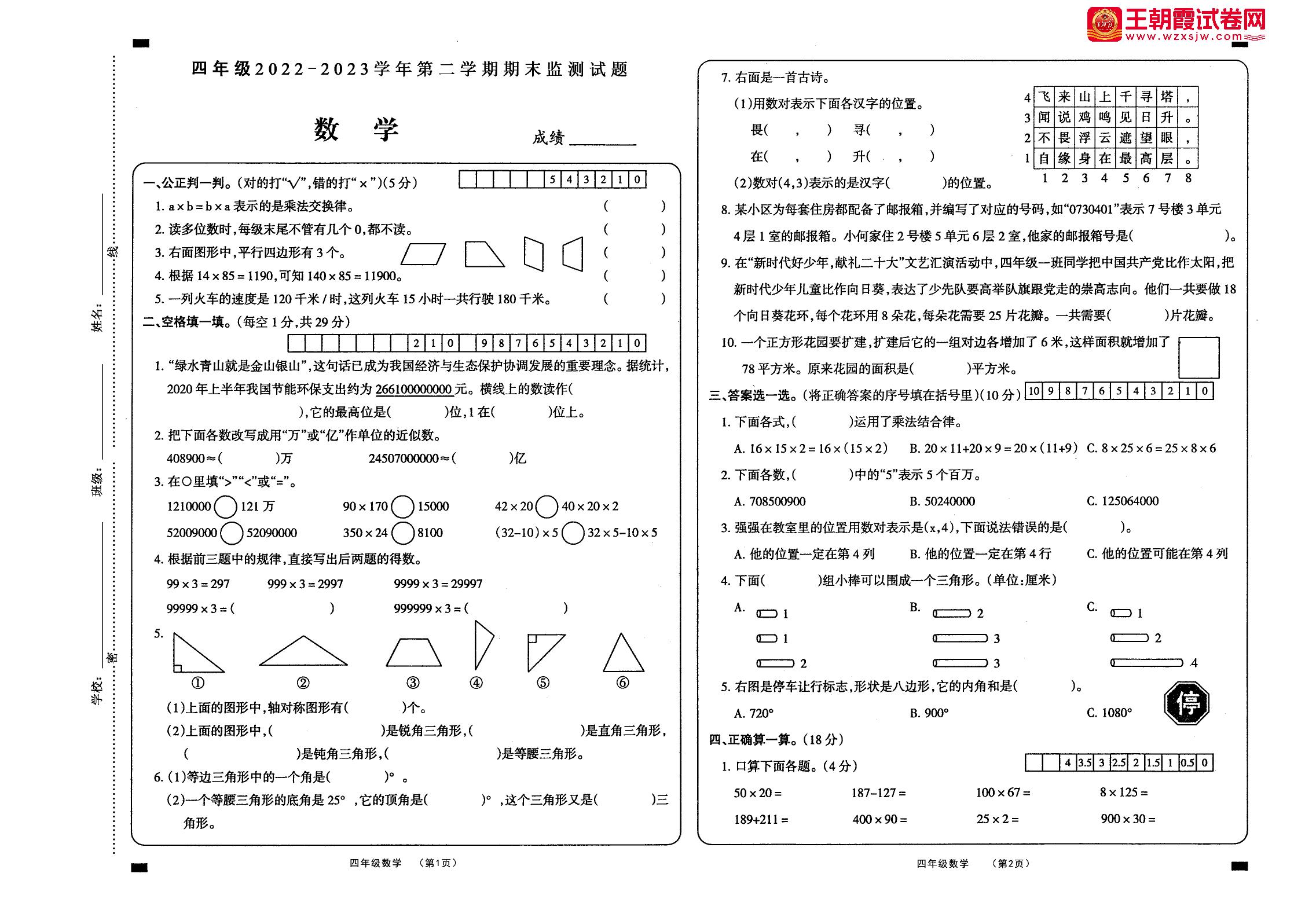 山西省大同市新荣区2022-2023学年第二学期期末监测试题四年级数学(苏教版)