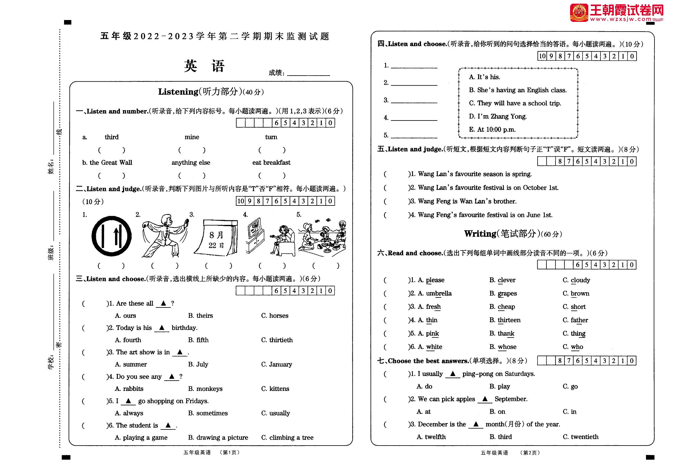 山西省大同市新荣区2022-2023学年第二学期期末监测试题五年级英语(人教PEP版)【无听力音频】