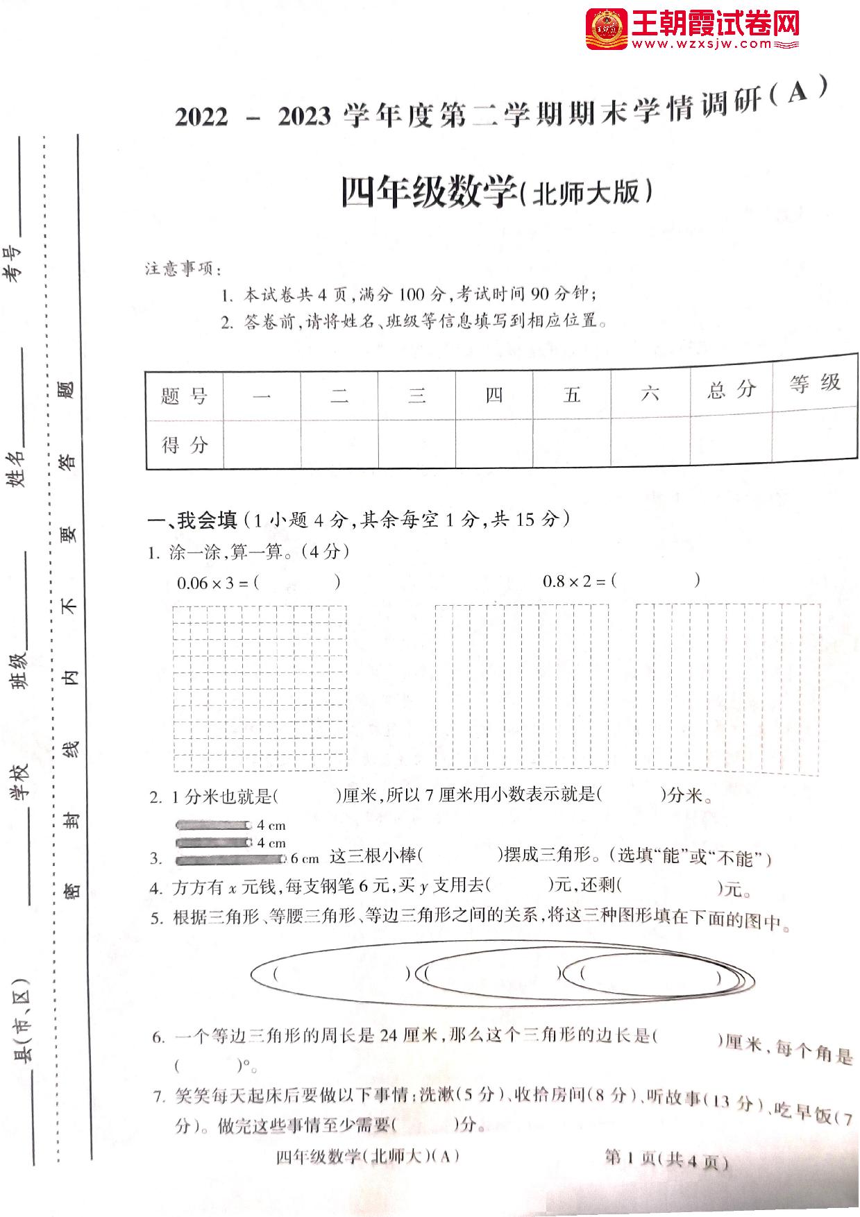 山西省吕梁市方山县城内第二小学2022-2023学年度第二学期期末学情调研四年级数学(北师版)