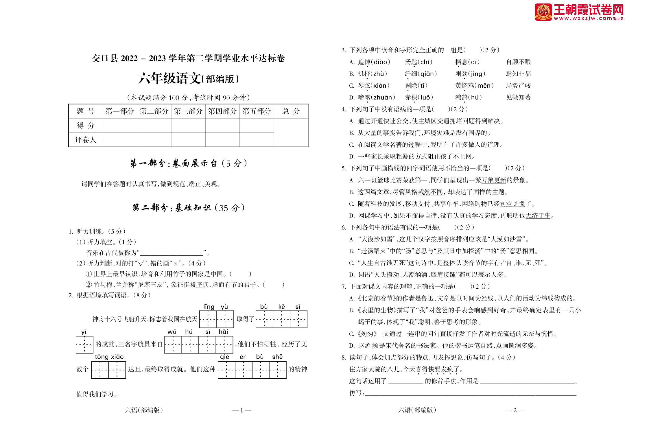 山西省吕梁市交口县2022-2023学年第二学期期末学业水平达标卷六年级语文(人教版)【不含听力音频】
