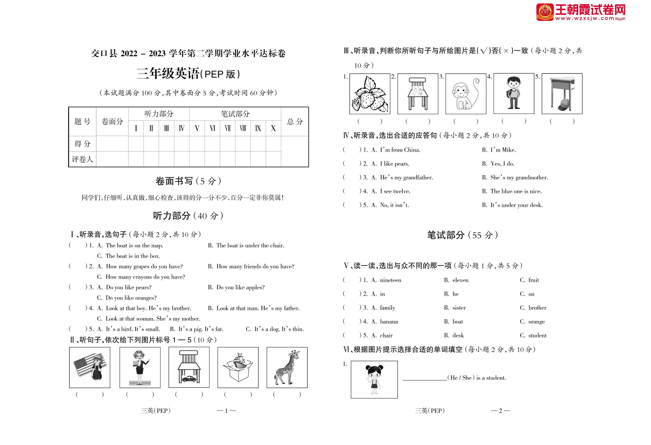 山西省吕梁市交口县2022-2023学年第二学期期末学业水平达标卷三年级英语(人教PEP版)【无听力音频】