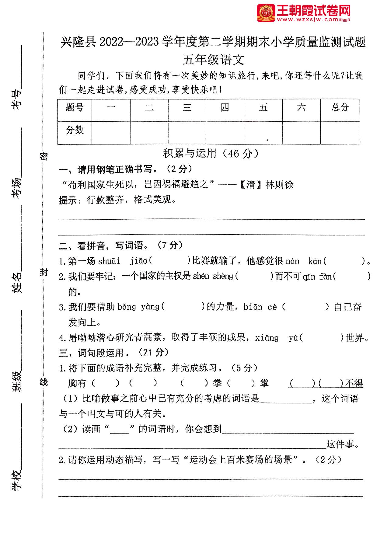 河北省承德市兴隆县2022-2023学年度第二学期期末小学质量监测试题五年级语文(人教版)