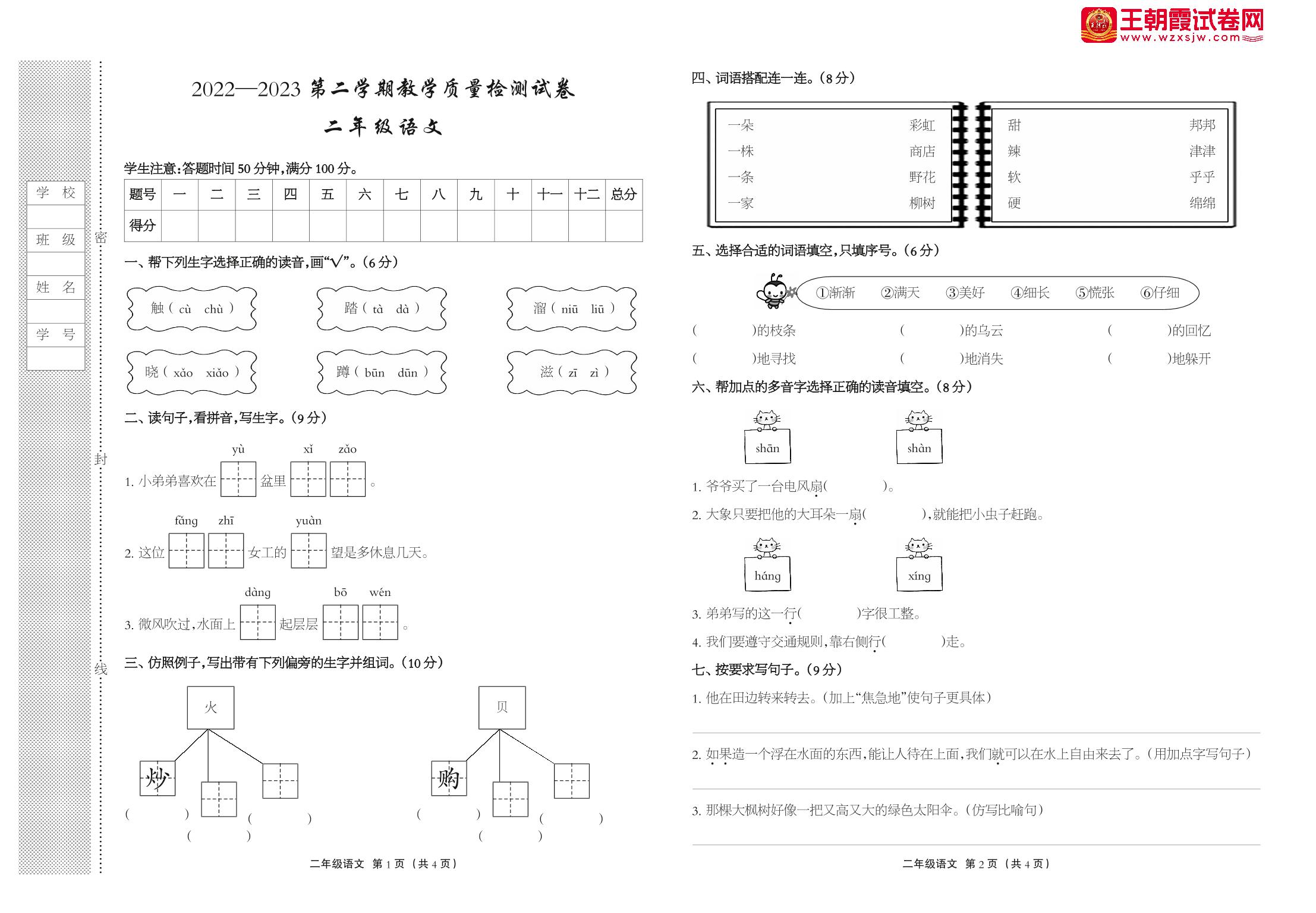 河北省衡水市景县2022-2023学年第二学期期末教学质量检测试卷二年级语文(人教版)
