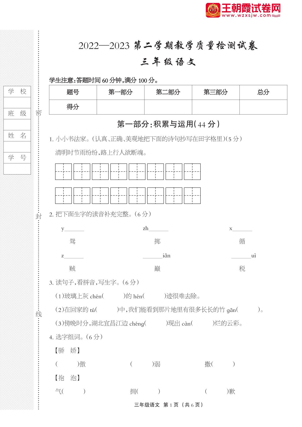 河北省衡水市景县2022-2023学年第二学期期末教学质量检测试卷三年级语文(人教版)