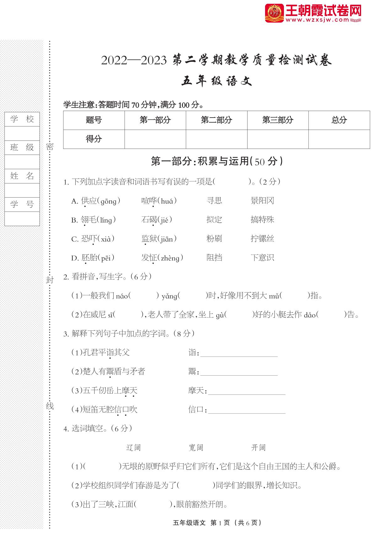 河北省衡水市景县2022-2023学年第二学期期末教学质量检测试卷五年级语文(人教版)