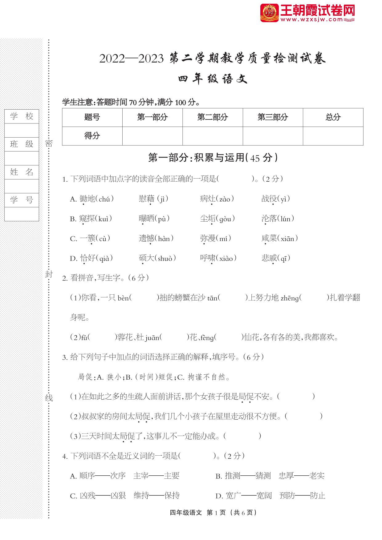 河北省衡水市景县2022-2023学年第二学期期末教学质量检测试卷四年级语文(人教版)