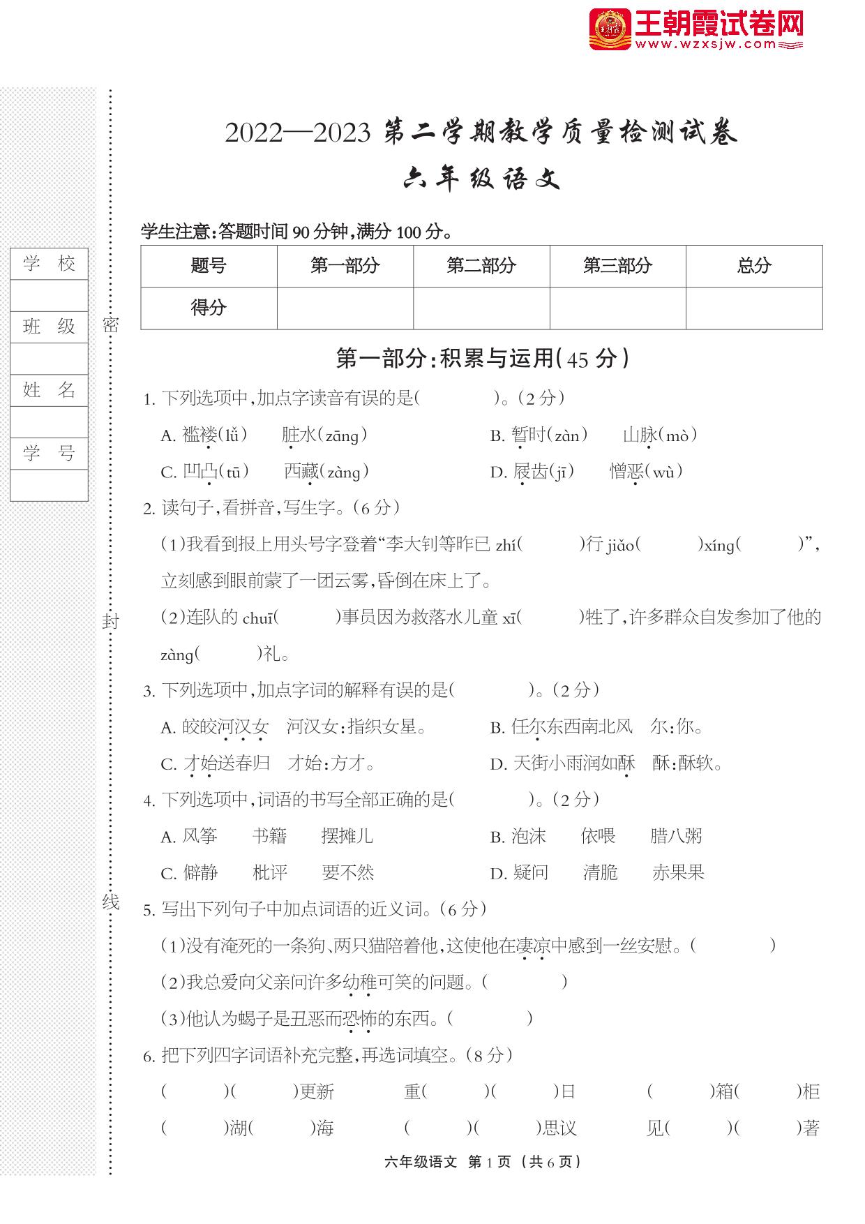 河北省衡水市景县2022-2023学年第二学期期末教学质量检测试卷六年级语文(人教版)