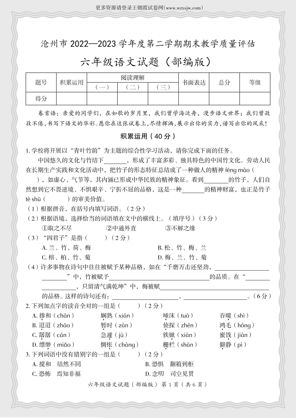 河北省沧州市2022-2023学年度第二学期期末教学质量评估试题六年级语文(人教版)