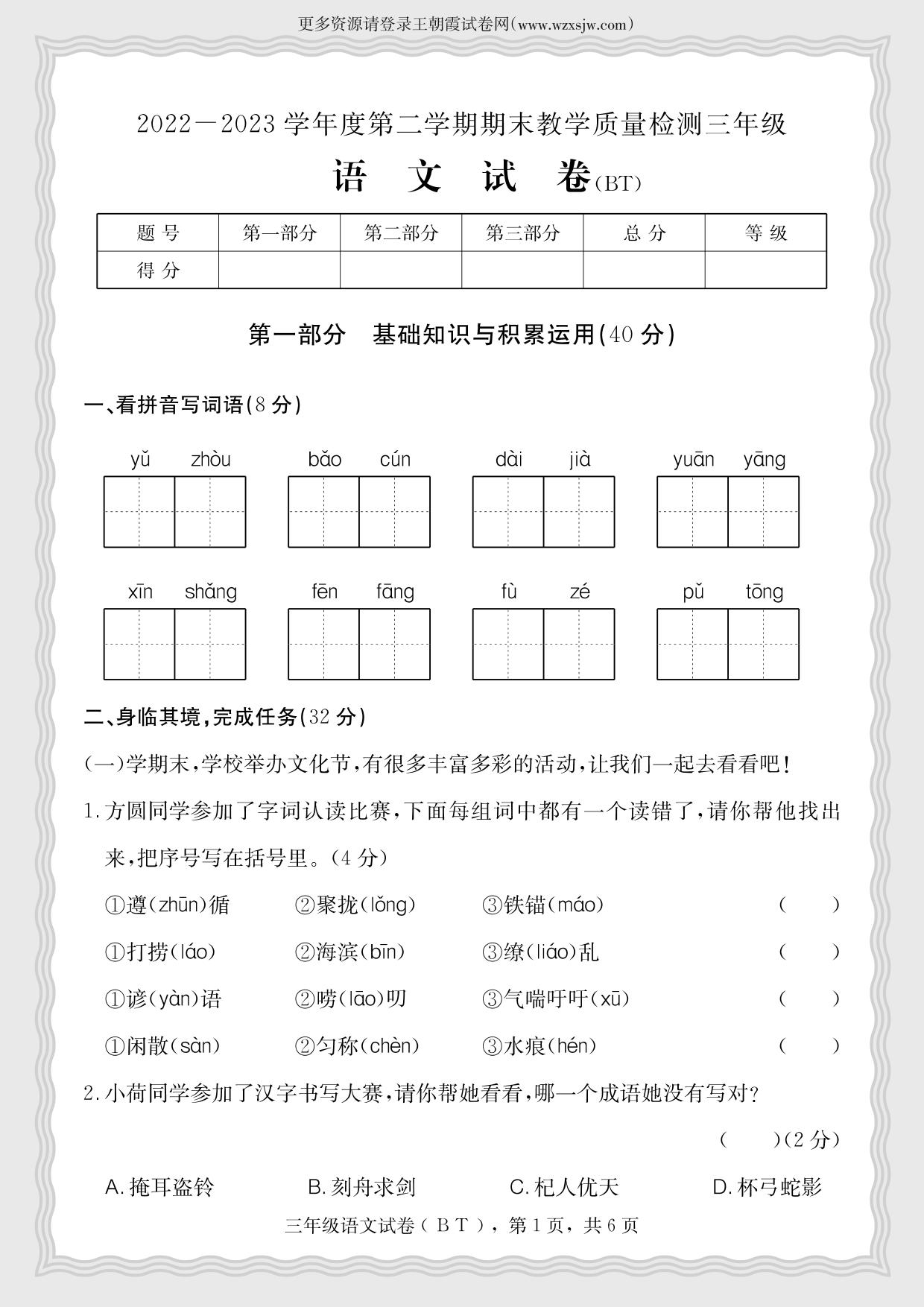 河北省沧州市泊头市2022-2023学年度第二学期期末教学质量检测三年级语文(人教版)