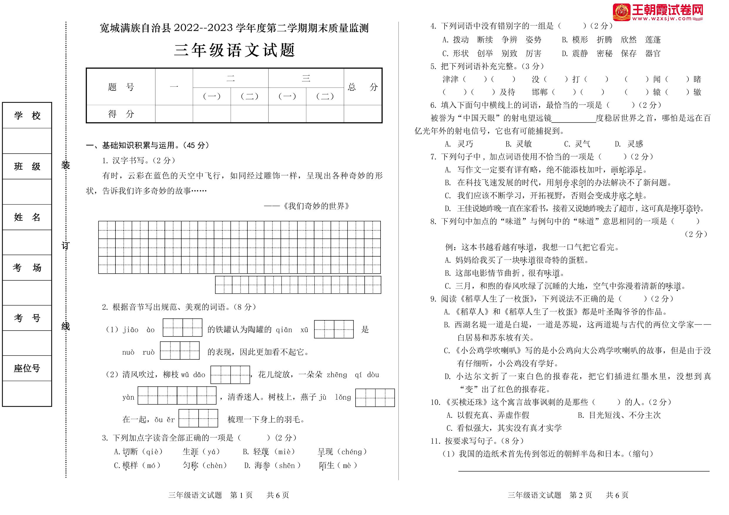 河北省承德市宽城满族自治县2022-2023学年度第二学期期末质量监测试题三年级语文(人教版)