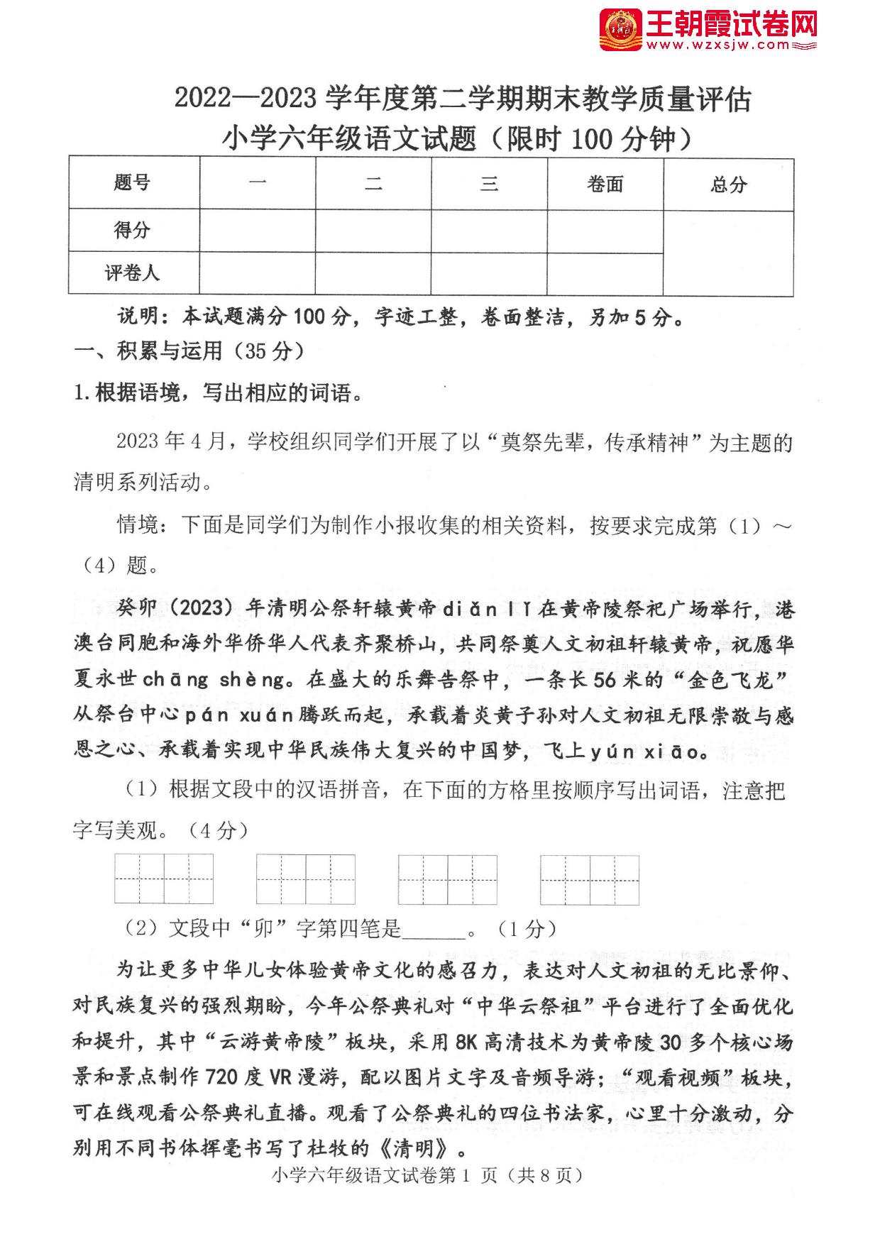 河北省沧州市盐山县2022-2023学年度第二学期期末教学质量评估试题六年级语文(人教版)