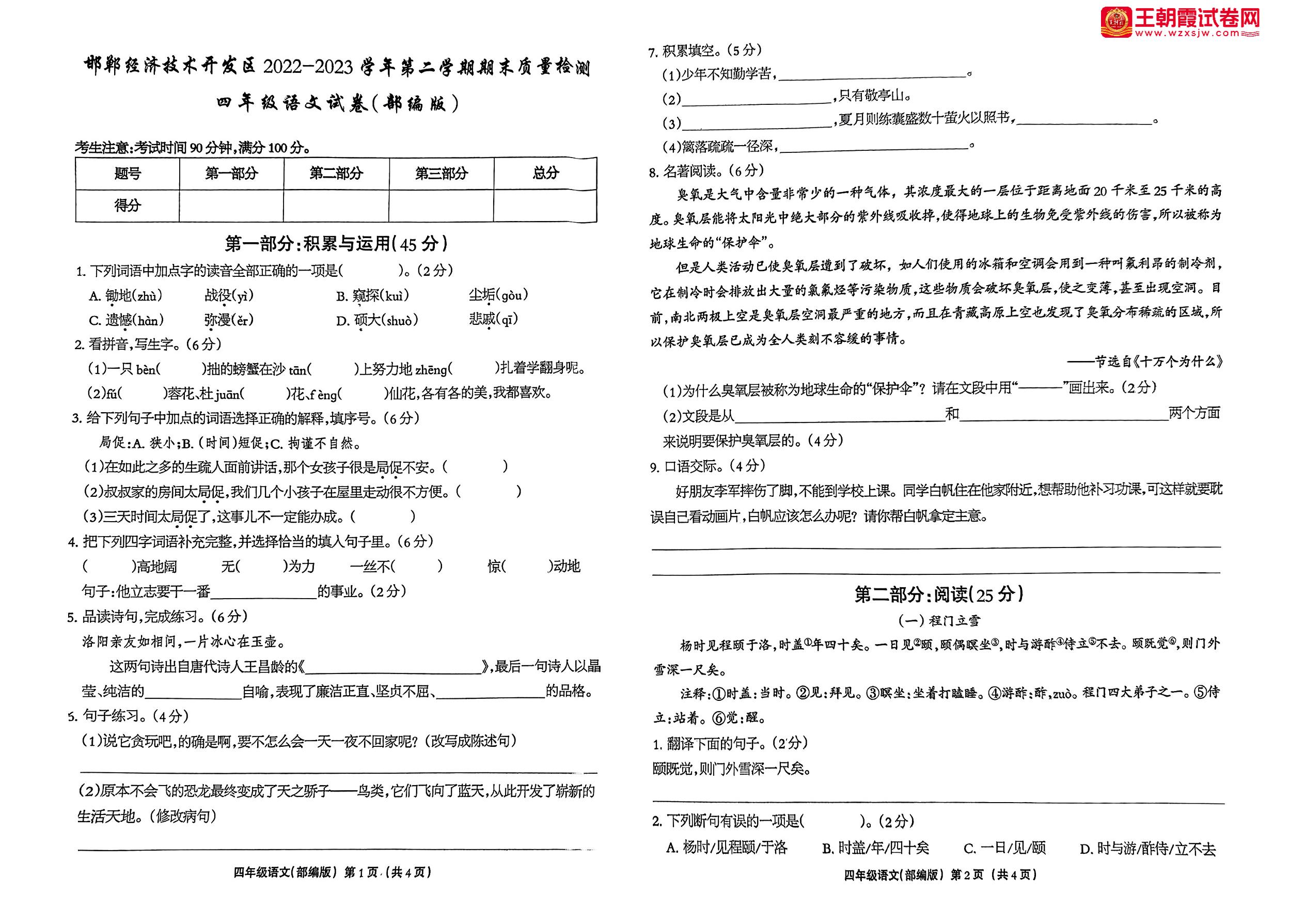 河北省邯郸市经济技术开发区2022-2023学年第二学期期末质量检测试卷四年级语文(人教版)
