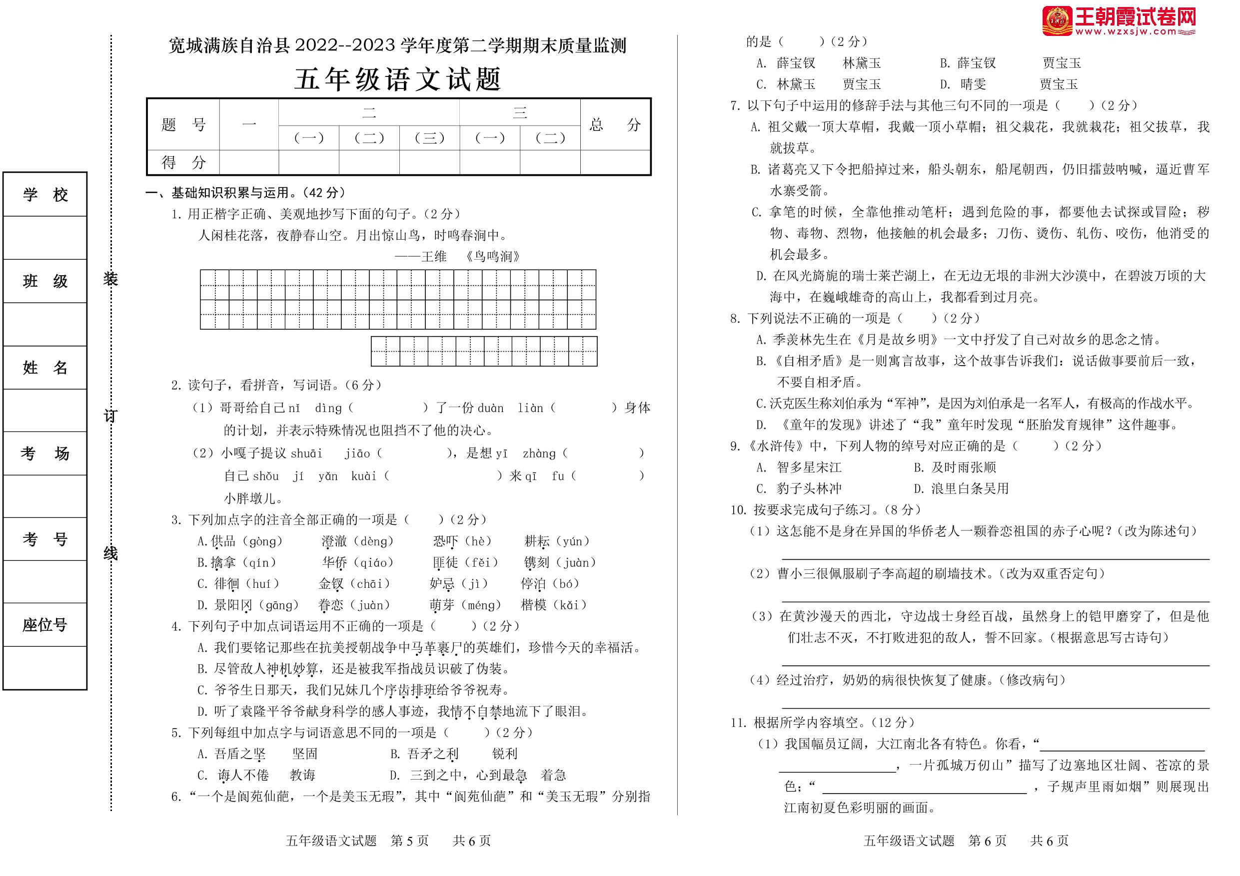 河北省承德市宽城满族自治县2022-2023学年度第二学期期末质量监测试题五年级语文(人教版)