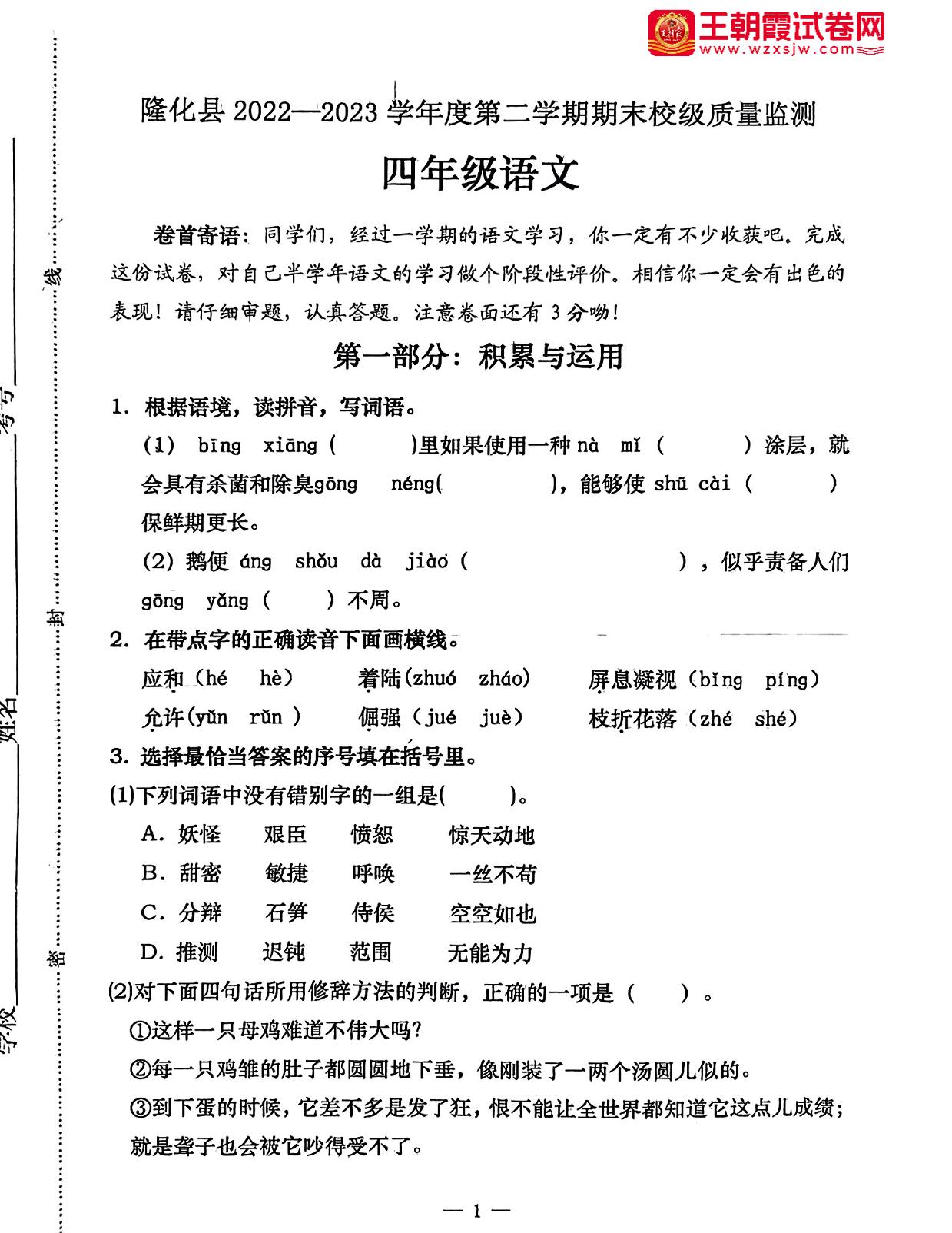河北省承德市隆化县2022-2023学年度第二学期期末校级质量监测四年级语文(人教版)