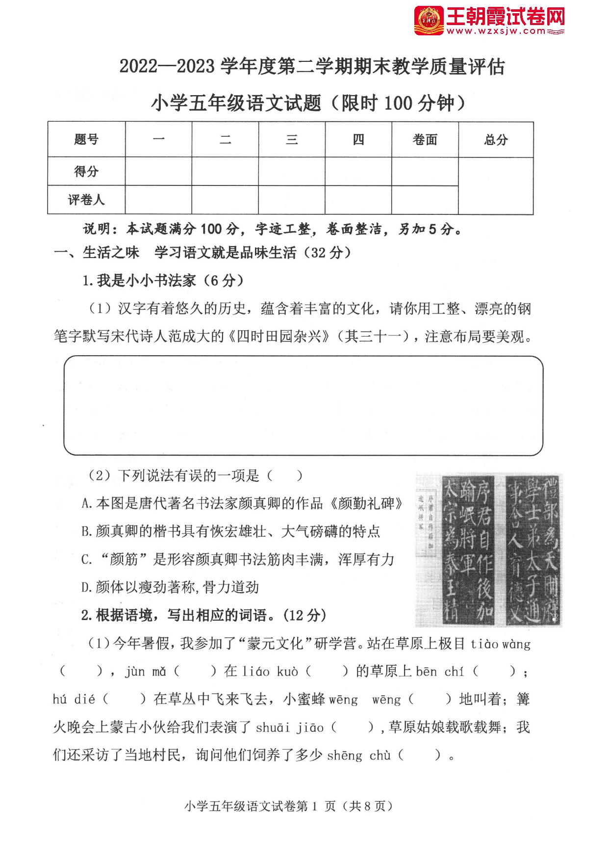 河北省沧州市盐山县2022-2023学年度第二学期期末教学质量评估试题五年级语文(人教版)