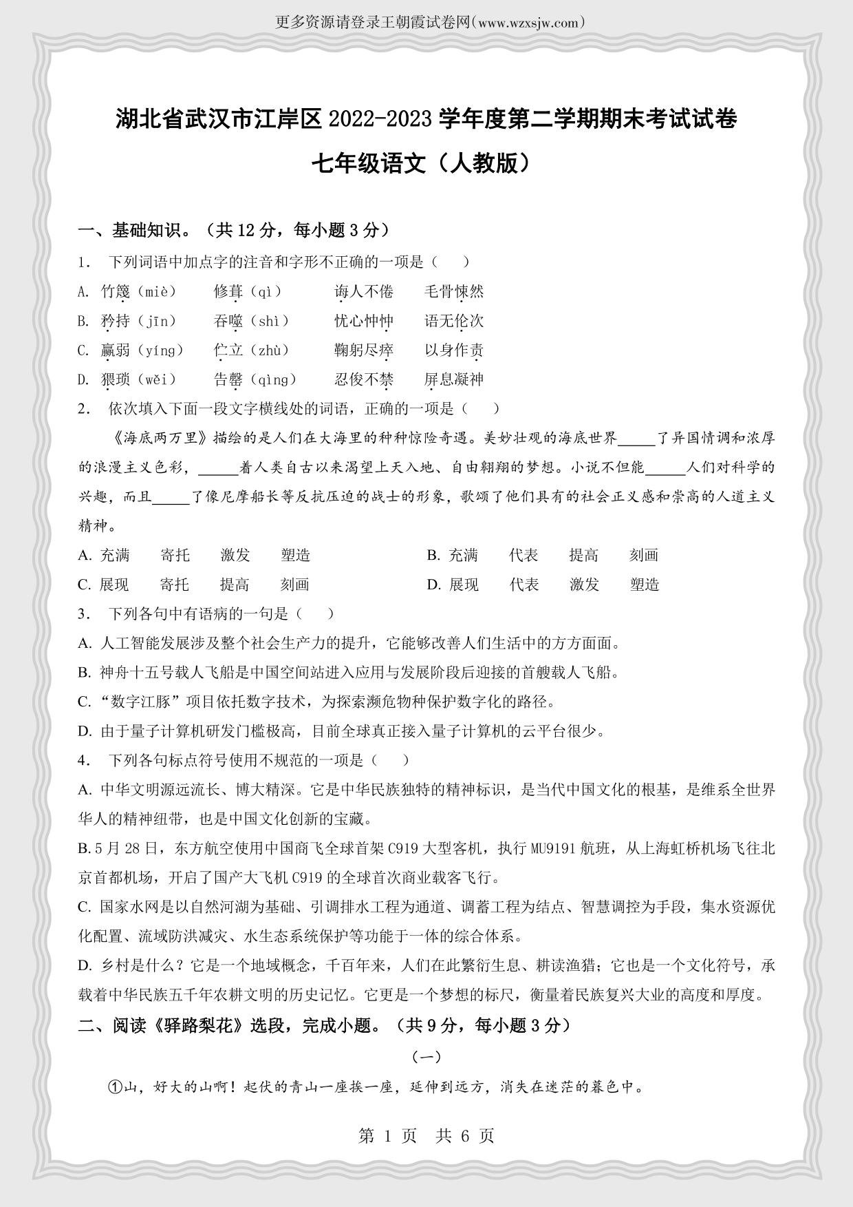 湖北省武汉市江岸区2022-2023字年下学期期末试题七年级语文(人教版)