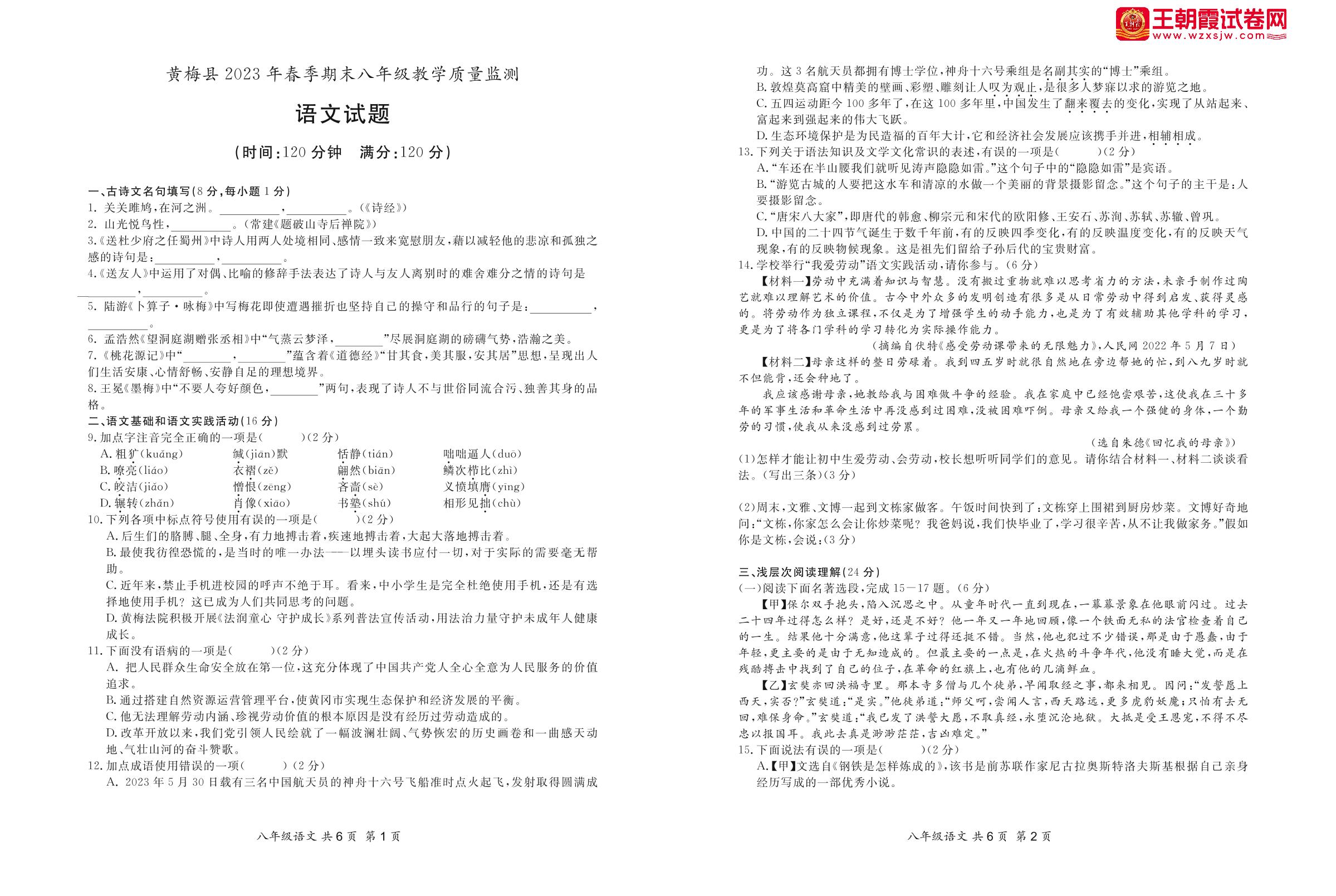 湖北省黄冈市黄梅县2022-2023学年下学期期末质量检测试题八年级语文(人教版)
