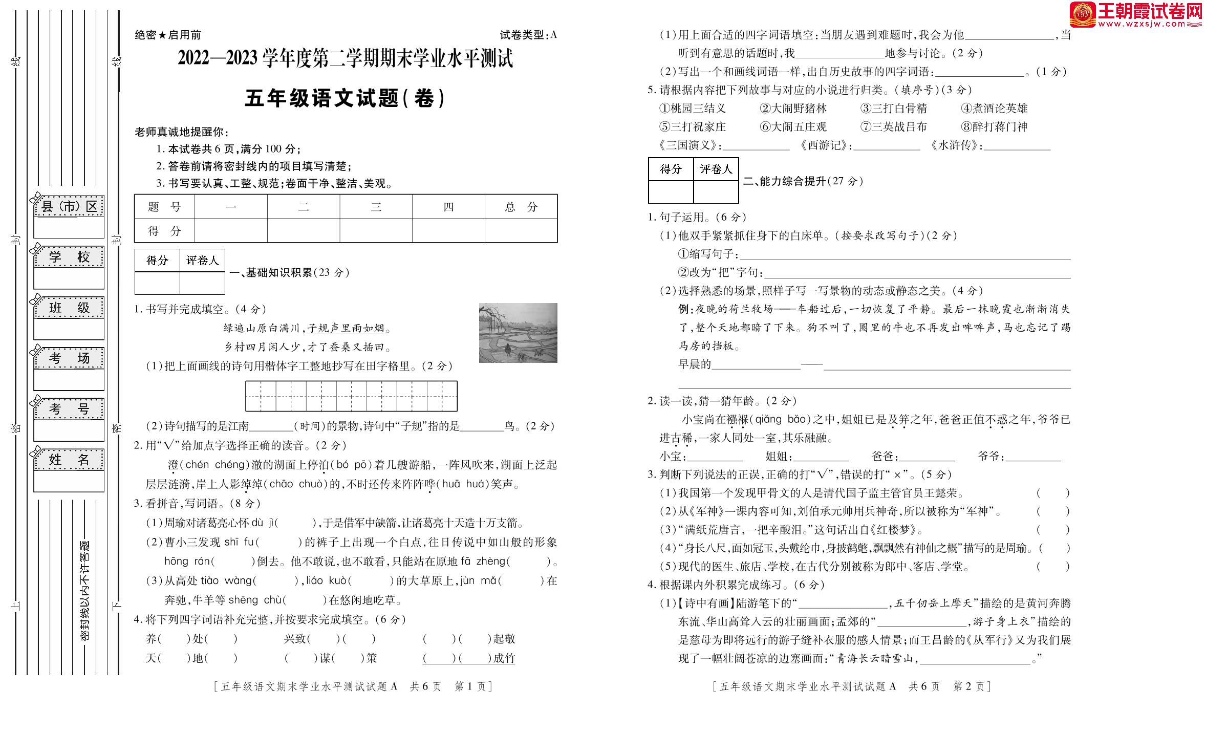 陕西省安康市紫阳县2022-2023学年度第二学期期末学业水平测试五年级语文(人教版)
