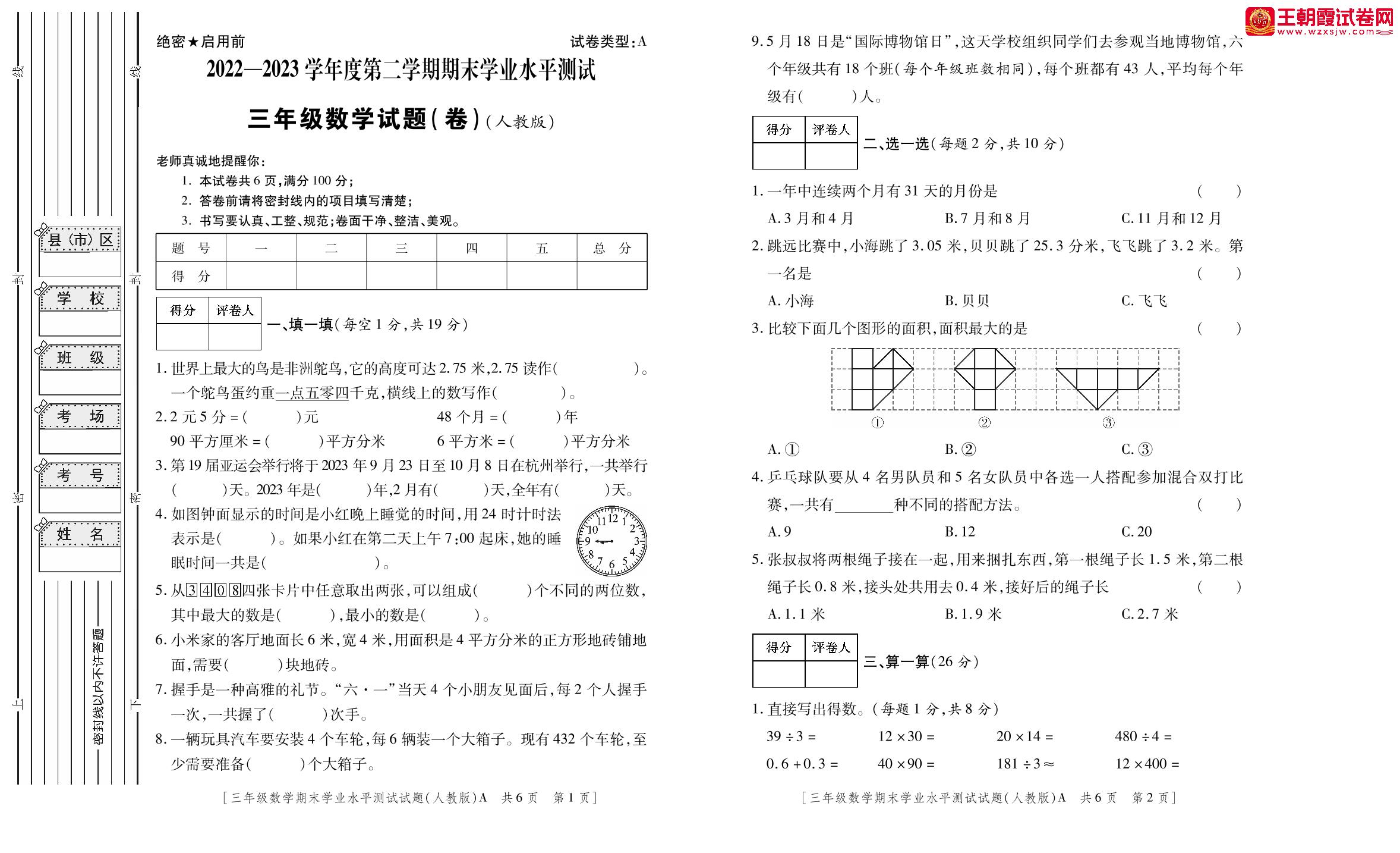 陕西省安康市紫阳县2022-2023学年度第二学期期末学业水平测试三年级数学(人教版)
