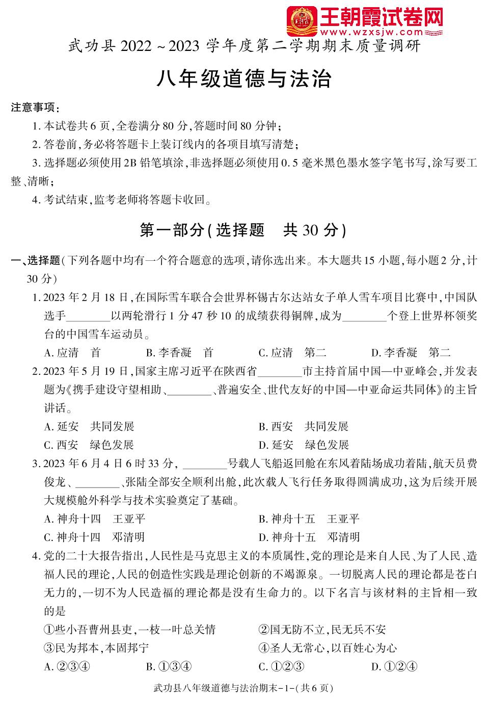 陕西省咸阳市武功县2022-2023学年度第二学期期末质量调研八年级道德与法治(人教版)
