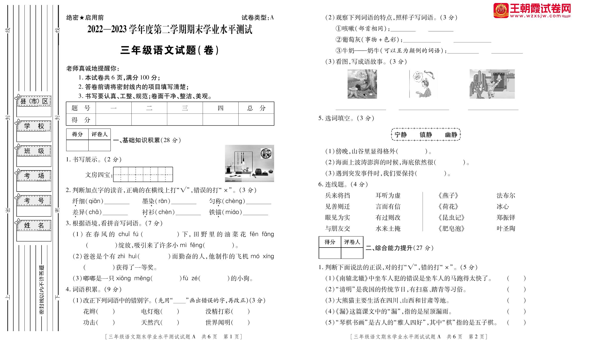 陕西省安康市紫阳县2022-2023学年度第二学期期末学业水平测试三年级语文(人教版)