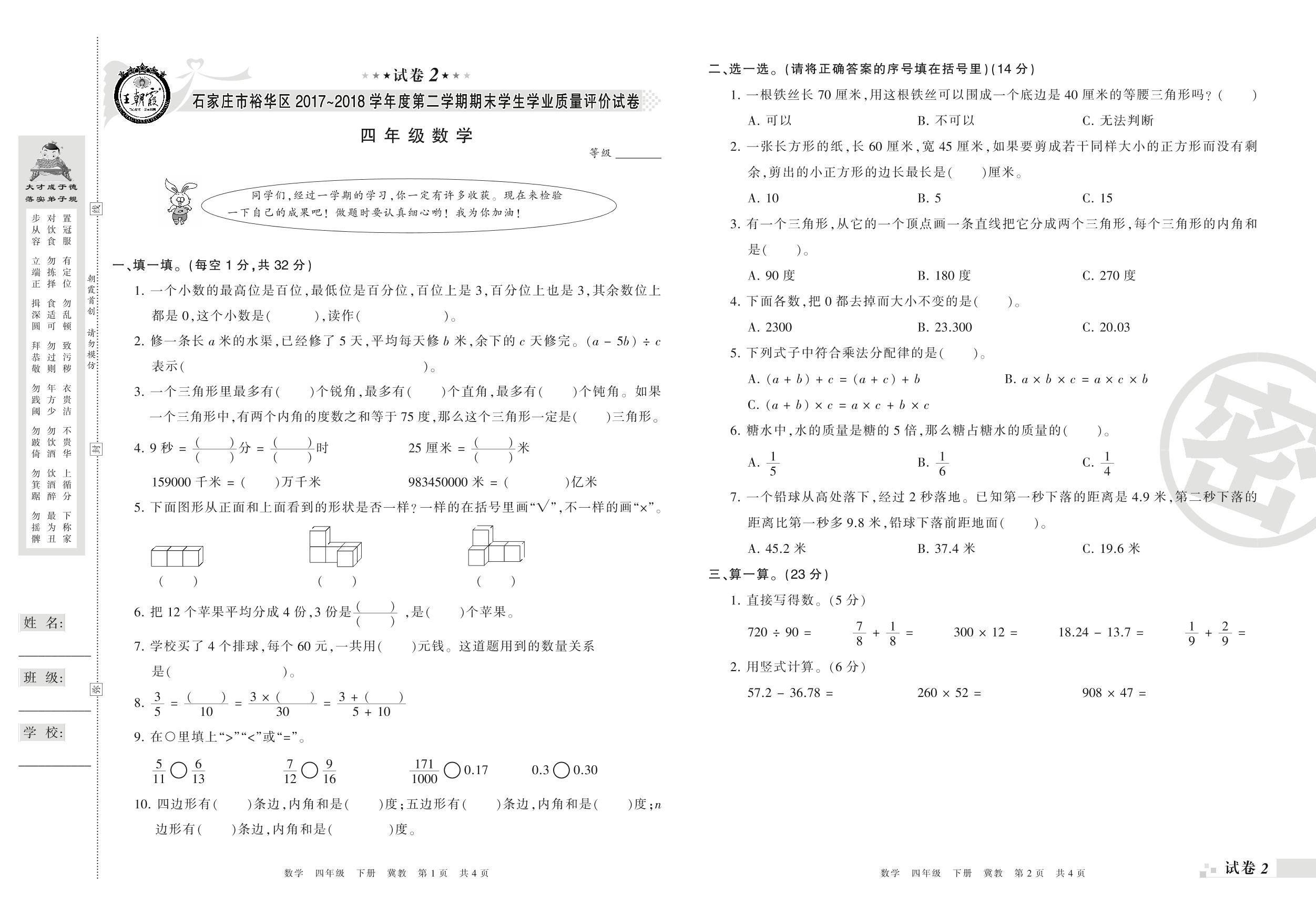 2017-2018学年第二学期石家庄市裕华区四年级数学试卷(冀教版)【2】