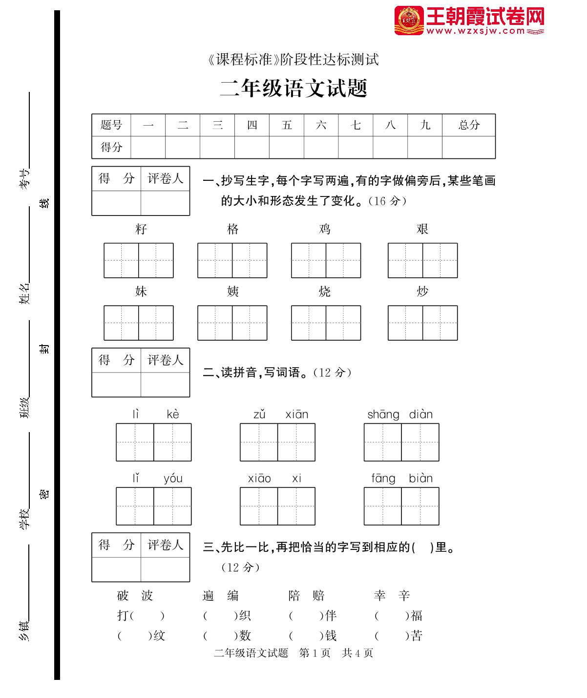 山东省济宁市泗水县2022-2023学年下学期(期末)阶段性达标测试二年级语文(人教版)