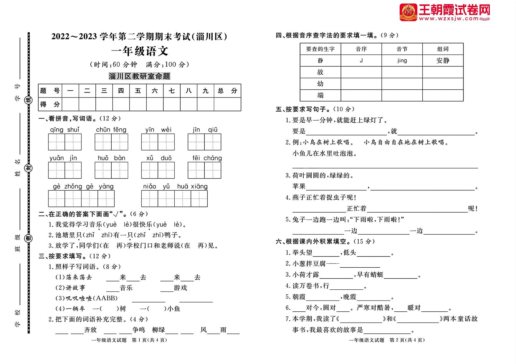 山东省淄博市淄川区2022-2023学年度第二学期期末考试一年级语文(人教版)