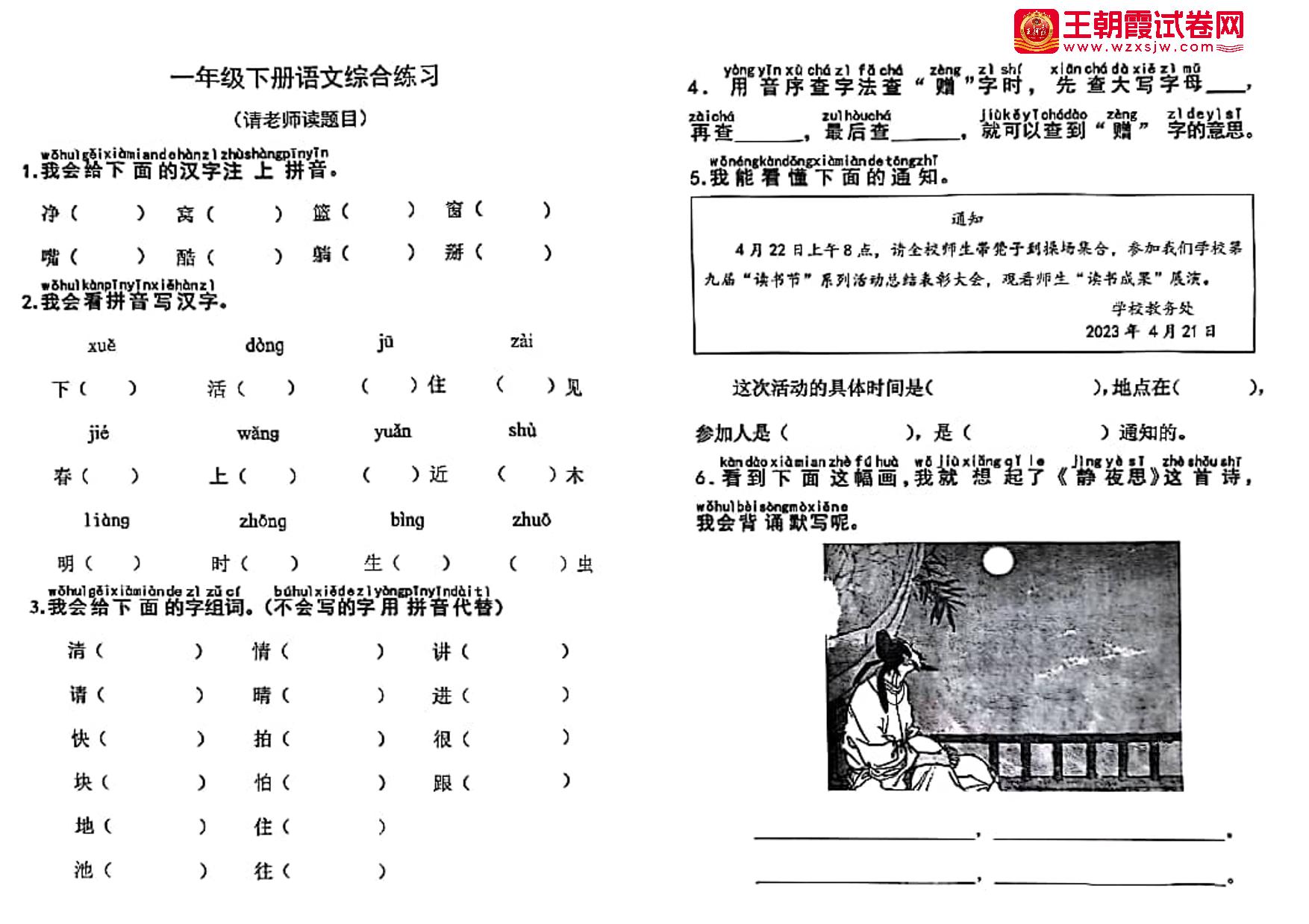 山东省济宁市鱼台县2022-2023学年下学期期末综合练习试题一年级语文(人教版)