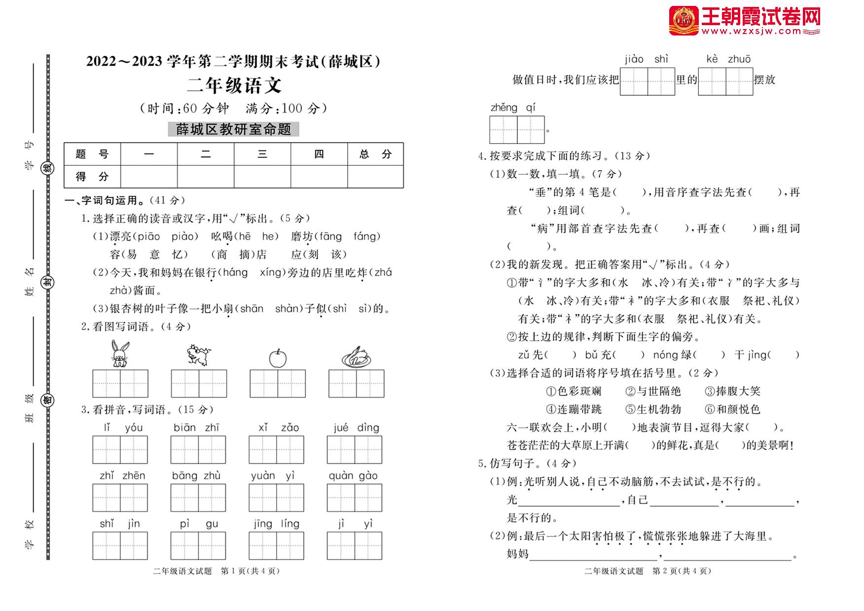 山东省枣庄市薛城区2022-2023学年第二学期期末考试二年级语文(人教版)