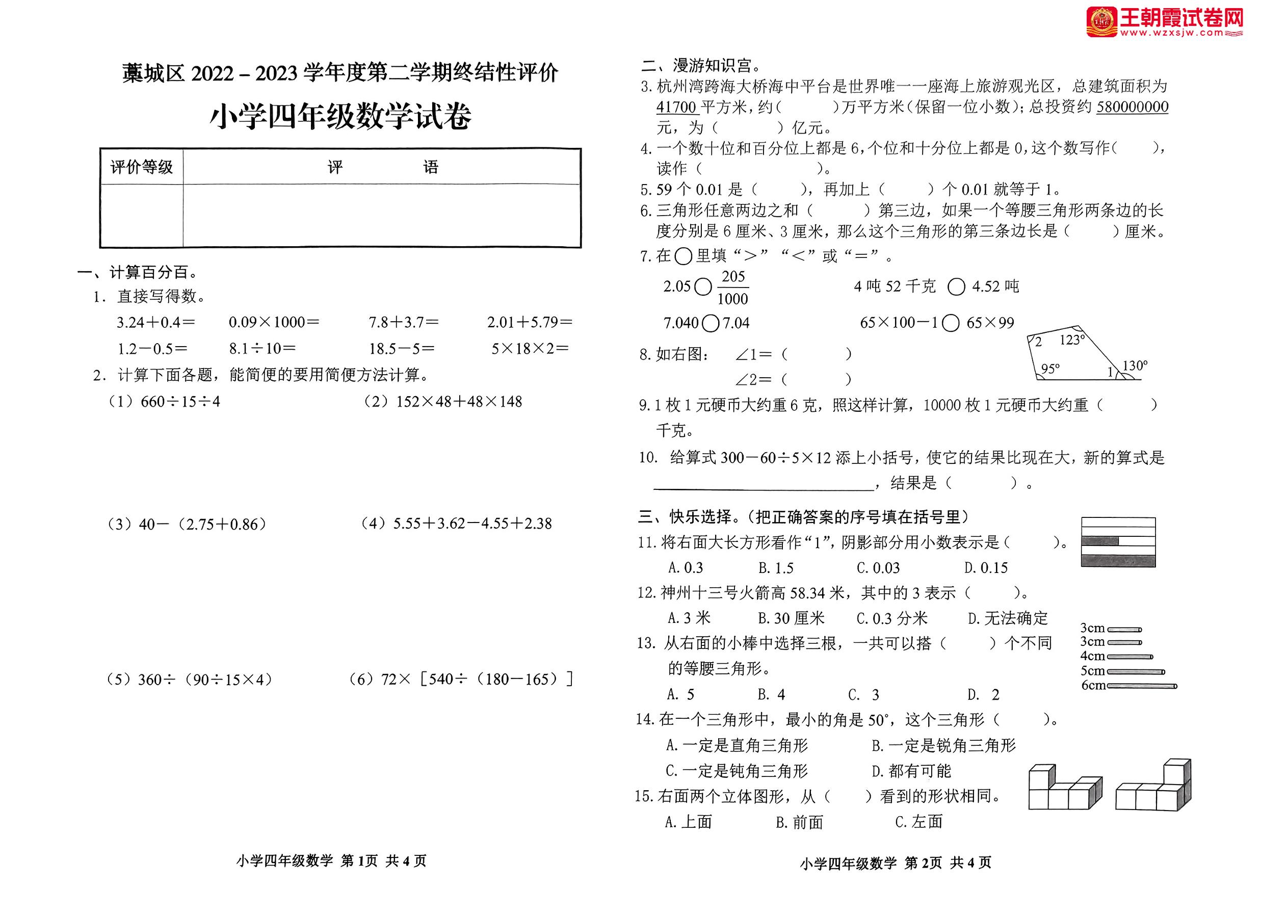 河北省石家庄市藁城区2022-2023学年度第二学期终结性评价试卷四年级数学(人教版)